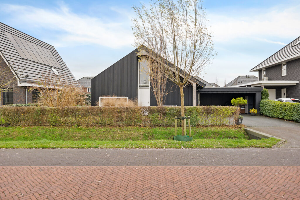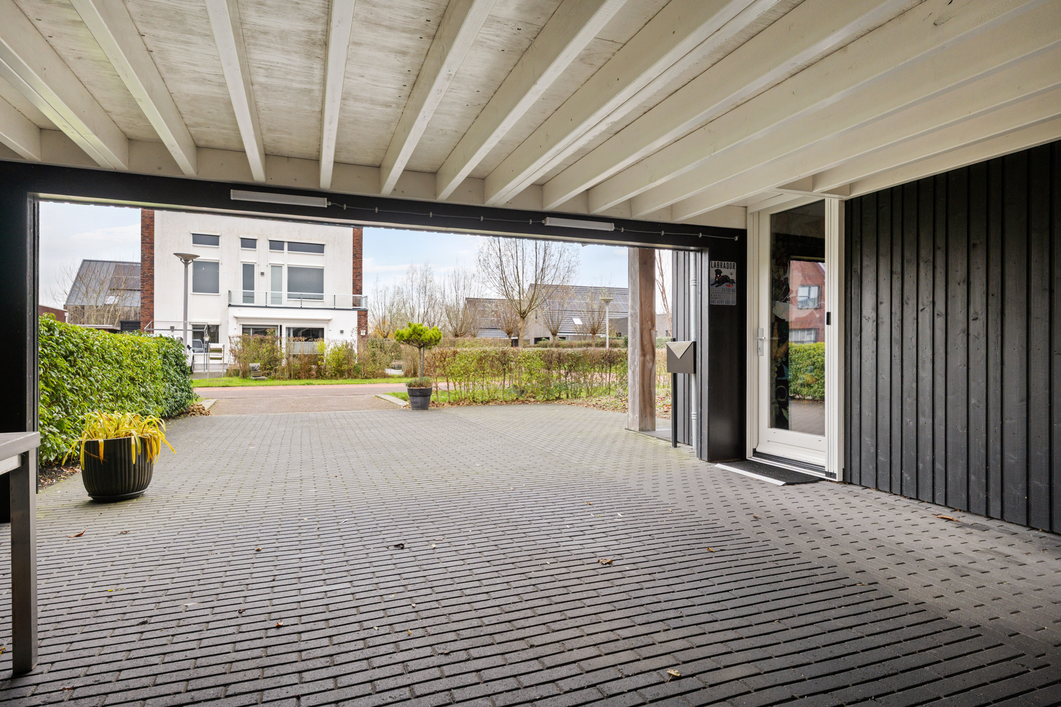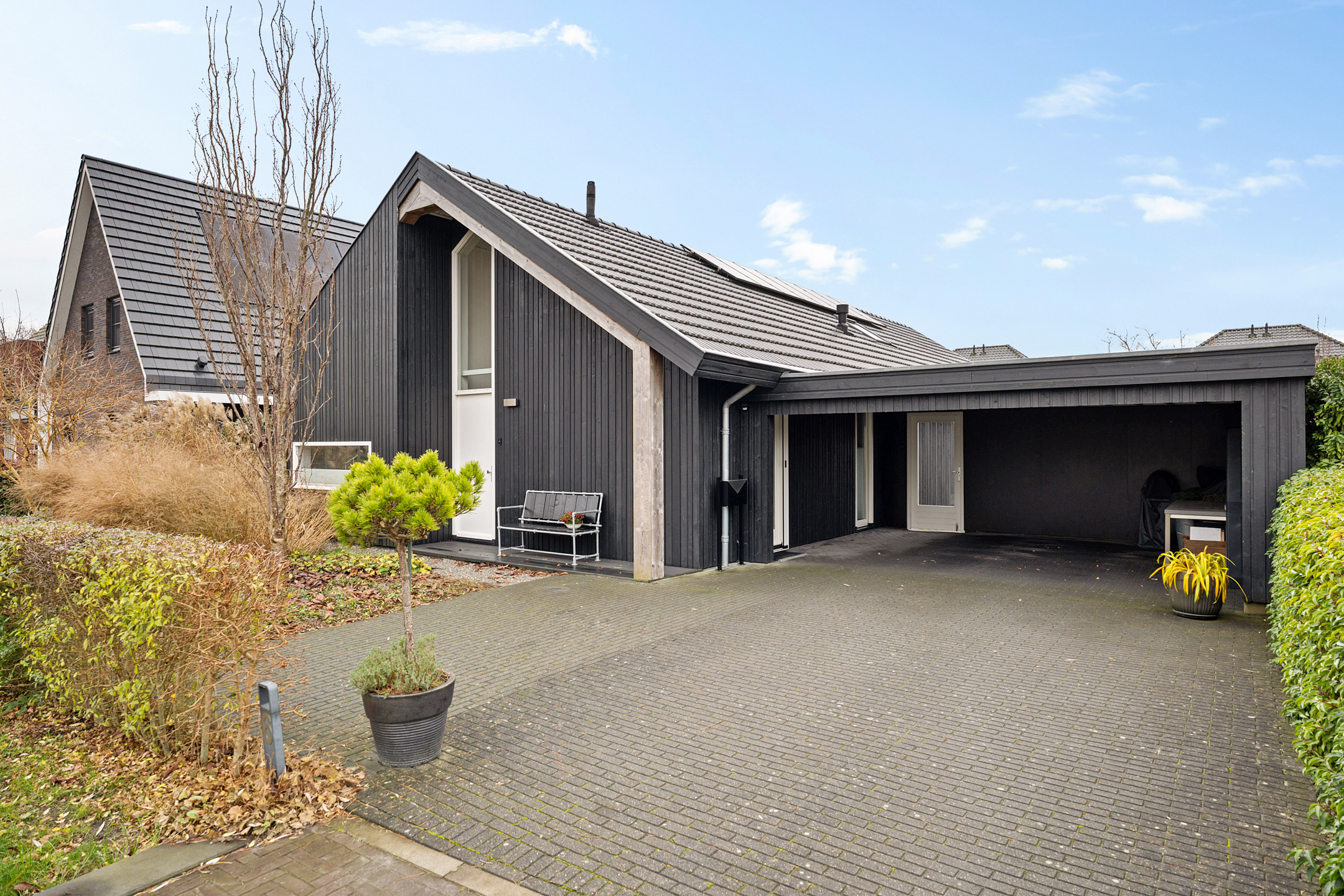 De tuin rondom de woning is fraai aangelegd en geeft het huis een verzorgde, uitnodigende uitstraling. Aan de zijkant bevindt zich de ruime carport (ca. 29,5 m²), geschikt voor meerdere voertuigen.