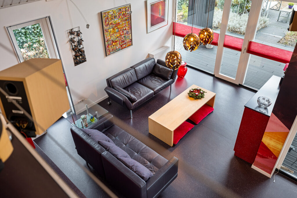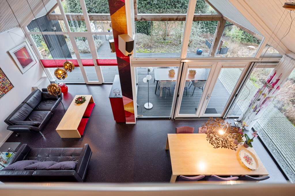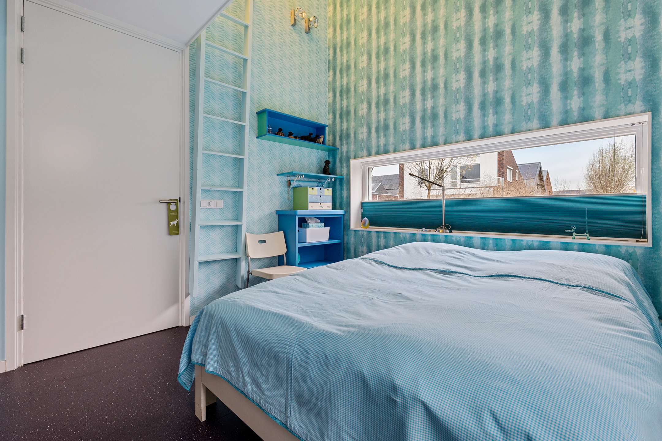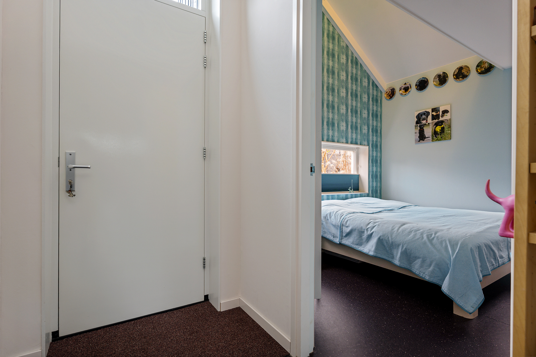 Vanuit de woonkamer leidt een trap naar de vide, waar zich een fijne werkplek bevindt met lichtinval via het Velux-dakraam en zicht op de tuin door de grote ramen van de woon- en eetkamer. Loop je verder door, dan bereik je de ruime zolderberging.