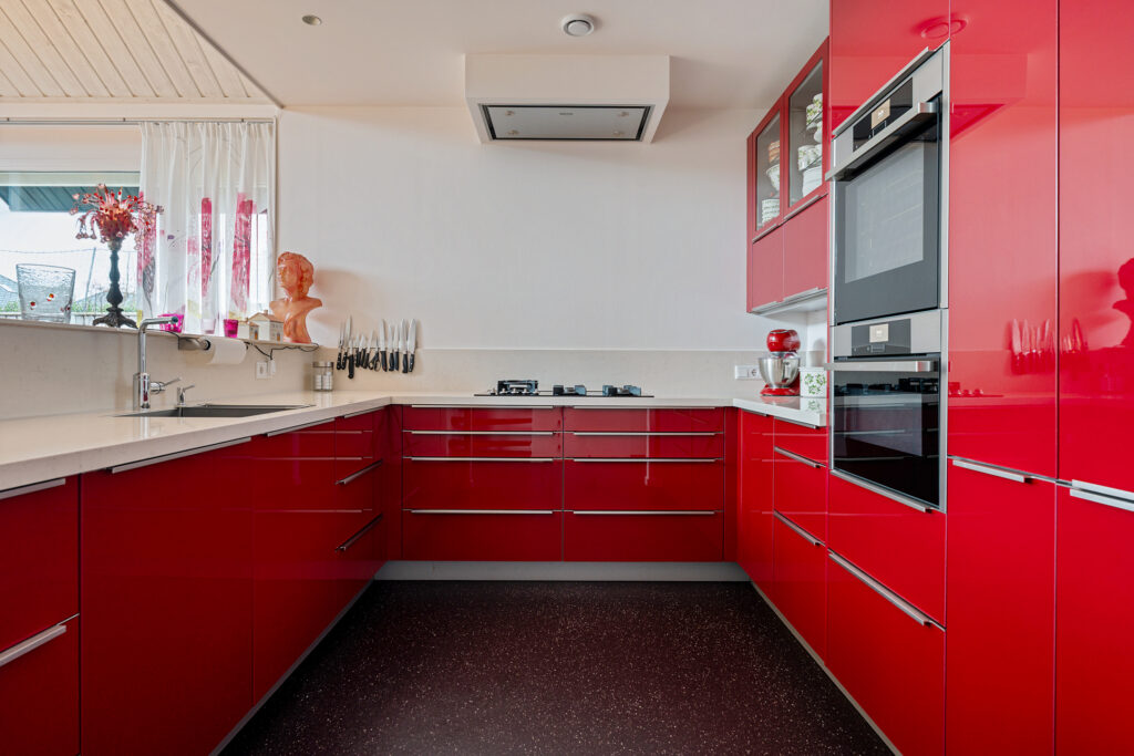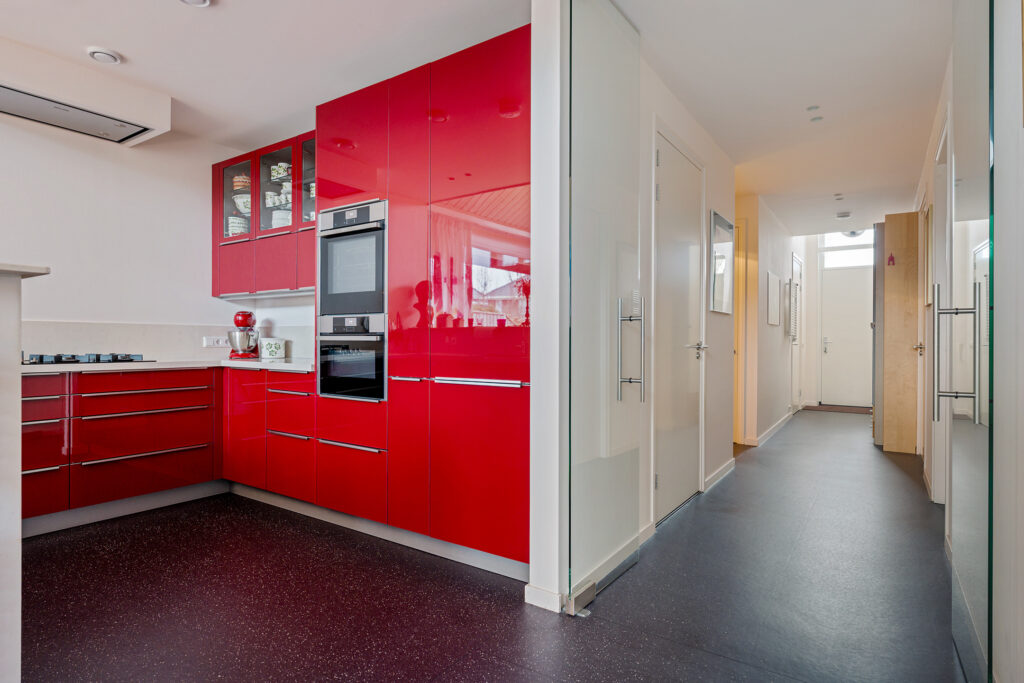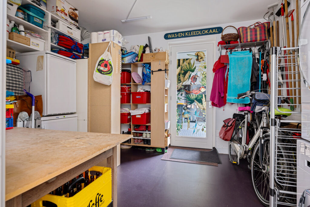 De keuken (ca. 9,1 m²) is halfopen en praktisch ingericht, met volop werkruimte en directe verbinding met de eetkamer. Daarnaast bevindt zich een ruime bijkeuken (ca. 11,6 m²) met opstelplaats voor wasapparatuur en extra bergruimte, eveneens met toegang naar buiten.
