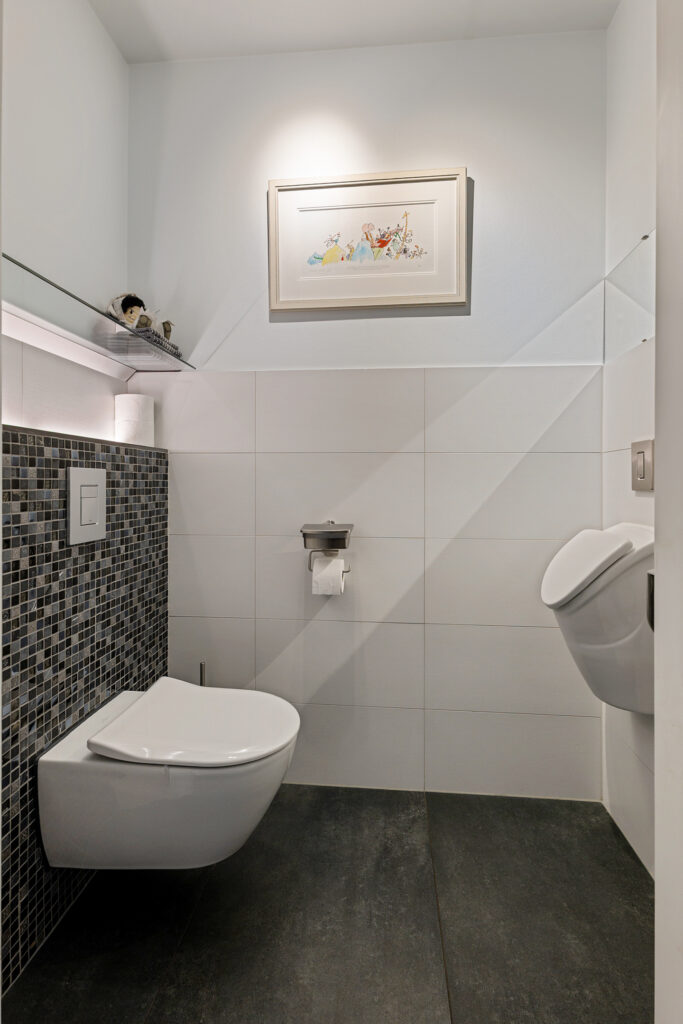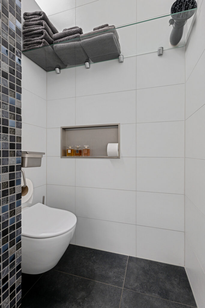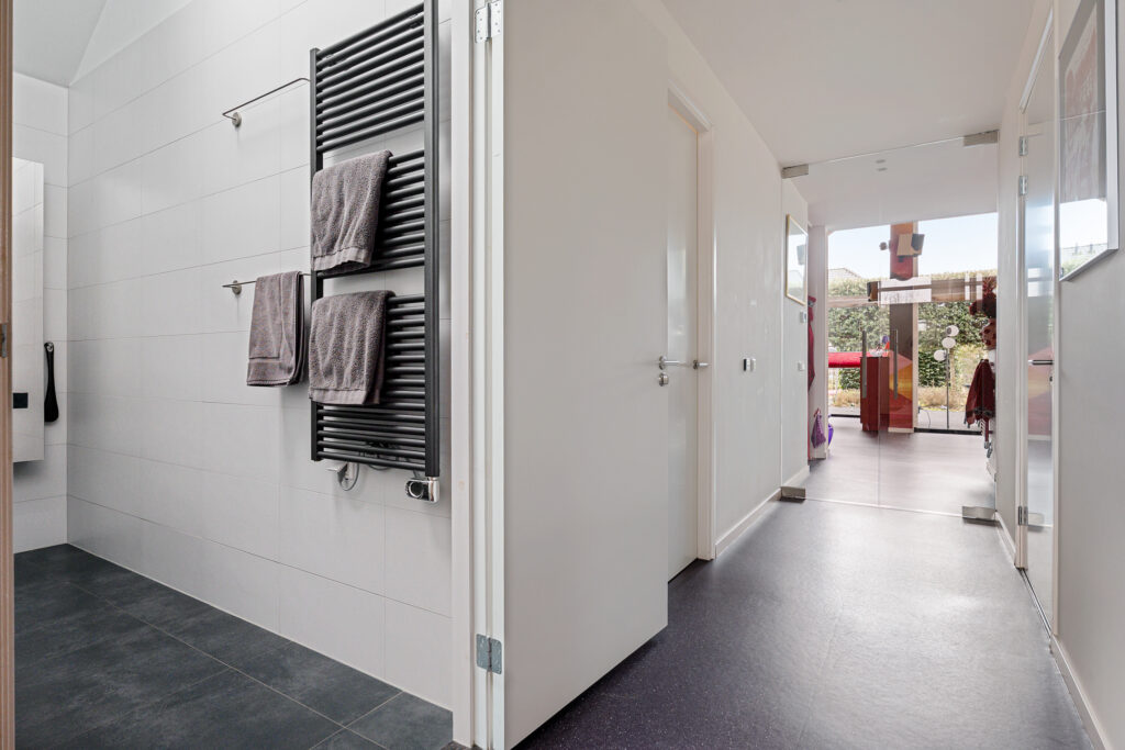 De badkamer (ca. 7,6 m²) is modern uitgevoerd en voorzien van een inloopdouche, dubbele wastafel, toilet en vloerverwarming. Daarnaast is er een separaat toilet in de hal aanwezig.