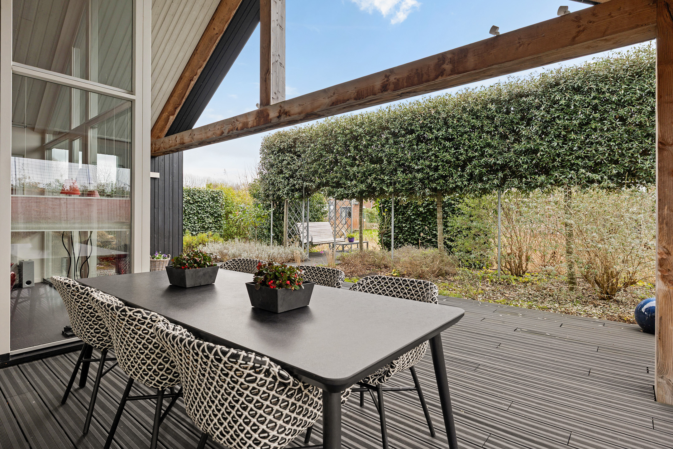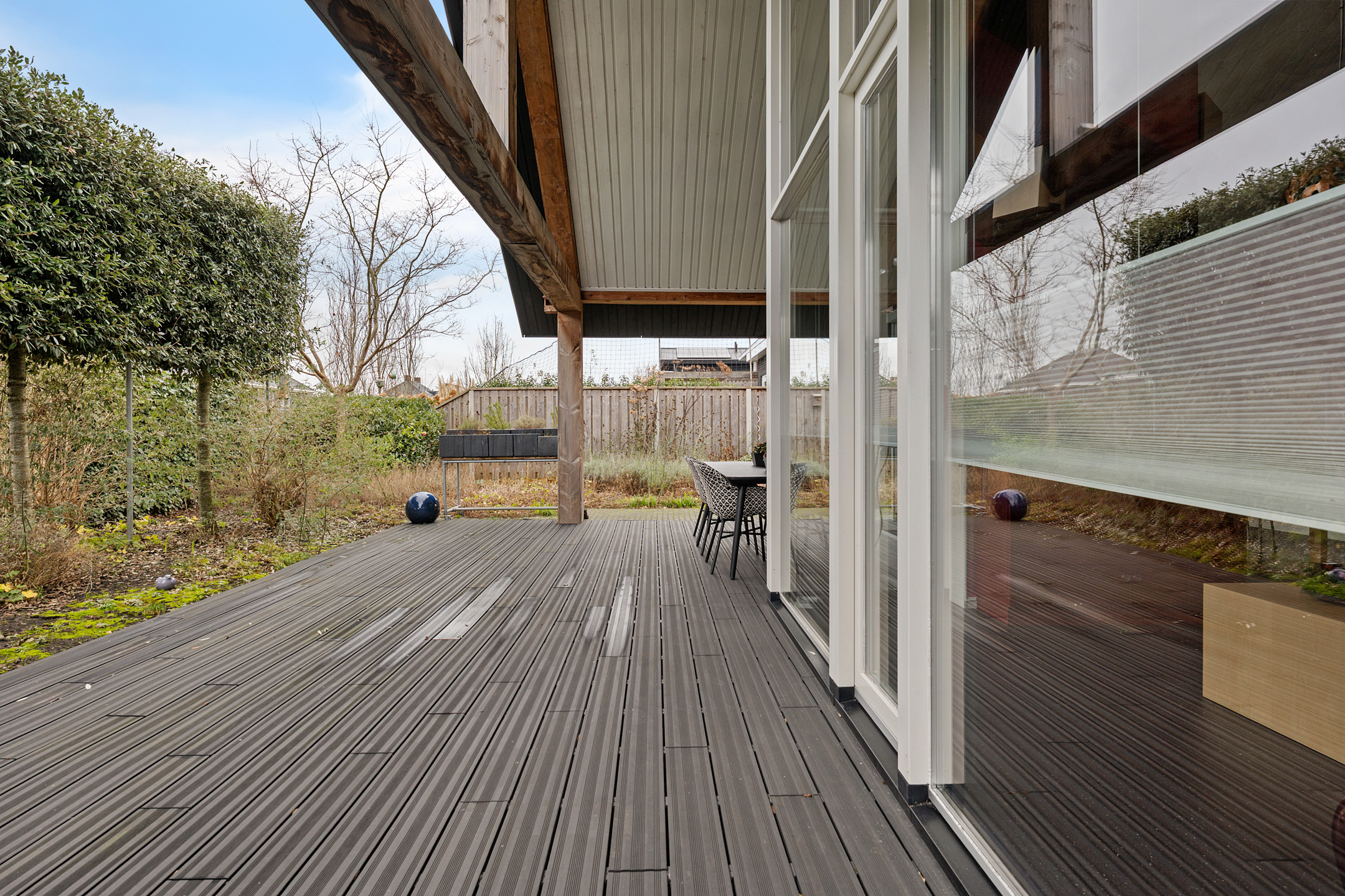 Aan de achterzijde ligt de absolute eyecatcher: een royale overkapping (ca. 22,1 m²) met zicht op zowel de tuin als het water. Hier geniet je van de rust, de prachtige ligging en het natuurlijke decor van de tuin, die elk seizoen een andere sfeer brengt. Een ideale plek om te ontspannen, te borrelen of te dineren met uitzicht op het water.
