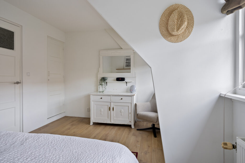 De indeling bestaat in de eerste plaats uit een heerlijke woonkamer met speelse erker, houten vloer, schouw met gashaard en heerlijke balkondeuren naar het balkon aan de achterzijde. Aansluitend de ruime keuken voorzien van een moderne inrichting met inbouwapparatuur. Ook op deze eerste woonlaag het eigentijds toilet en de trapopgang naar de bovenste verdieping. Deze bovenste verdieping biedt plaats aan twee - oorspronkelijk vermoedelijk drie - slaapkamers, beiden met keurige laminaatvloeren overigens. Eén van de slaapkamers beschikt over een vaste kast, de andere juist over een tweede balkon. De eigentijdse badkamer is voorzien van een inloopdouche en wastafel meubel. Een vlizotrap leidt tot slot naar de bevloerde vliering.