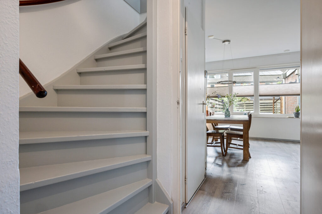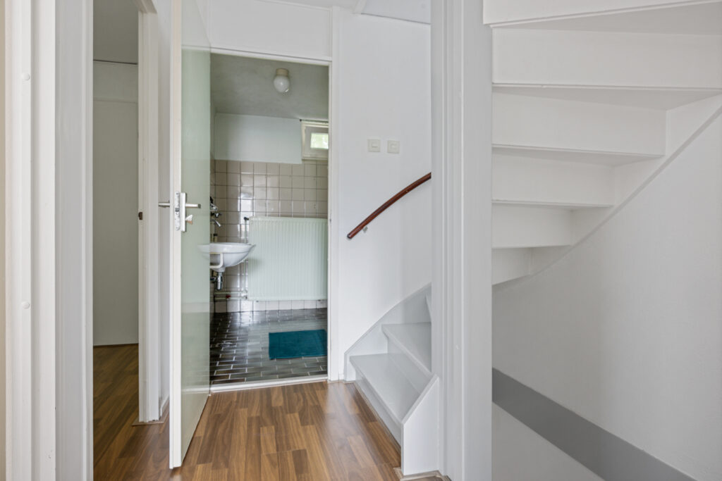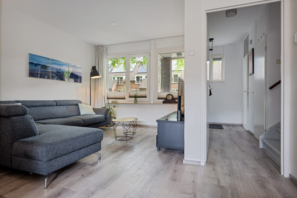 Bij binnenkomst tref je een ruime hal met meterkast, toegang tot het toilet en de woonkamer, evenals de trapopgang naar de eerste verdieping. De woonkamer bevindt zich aan de voorzijde en geniet van veel lichtinval dankzij de grote raampartijen.