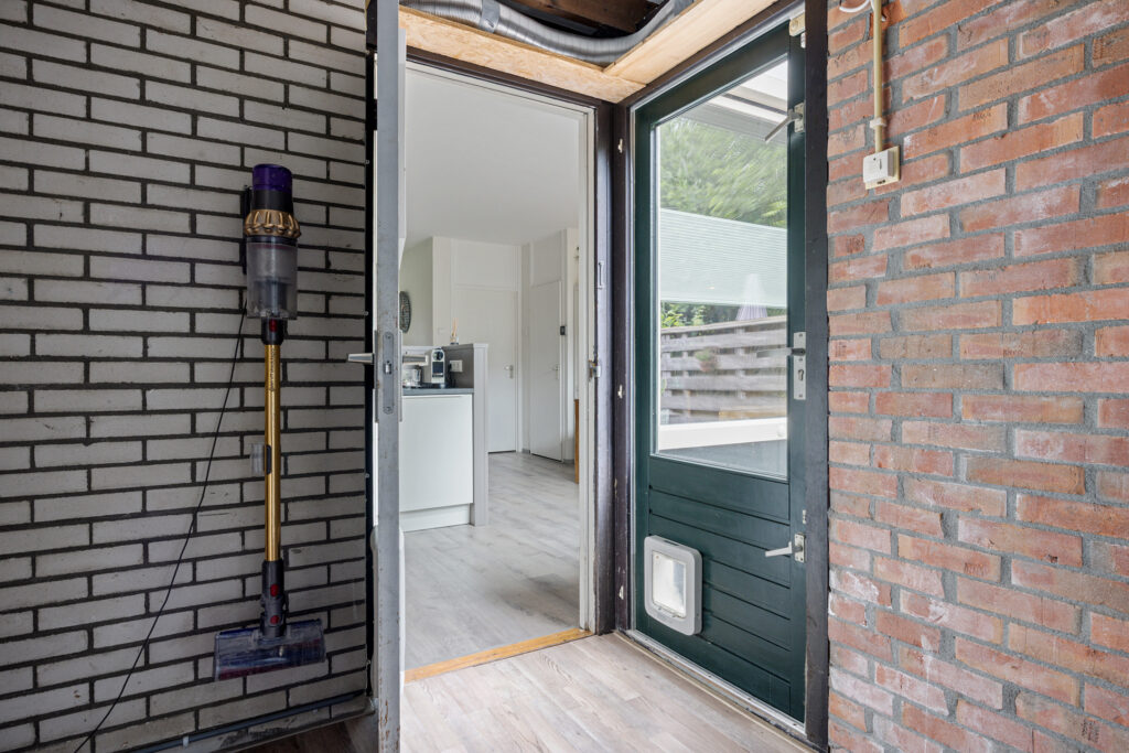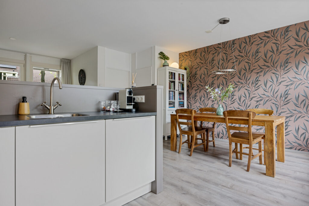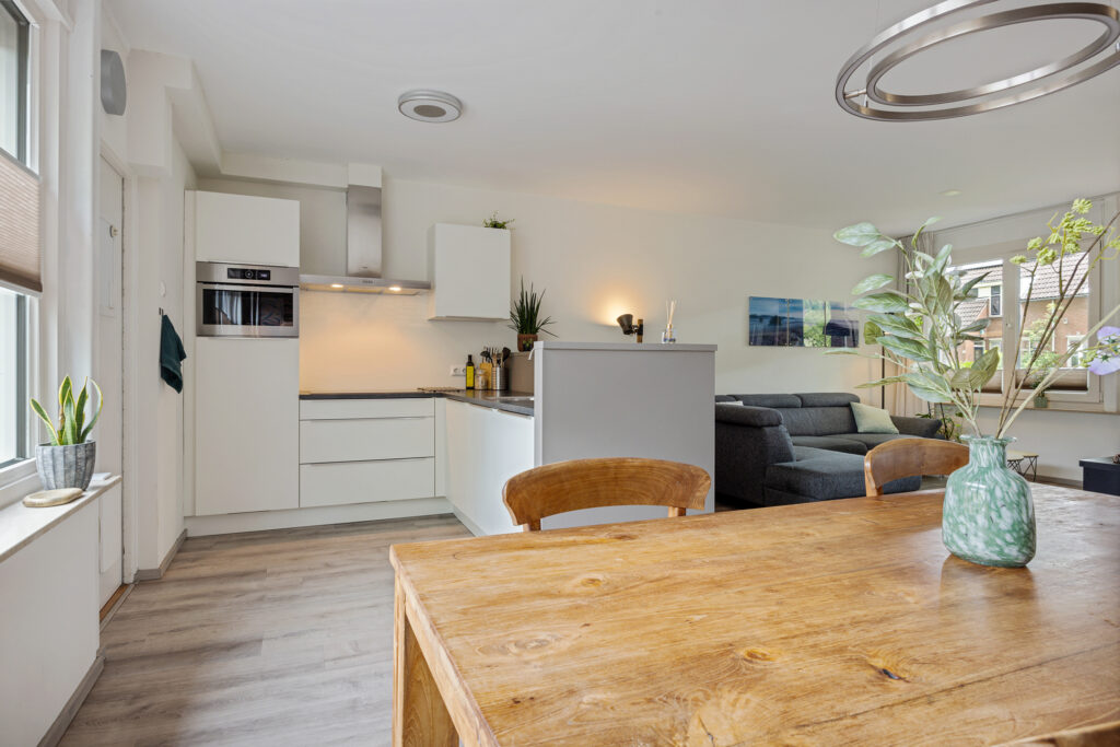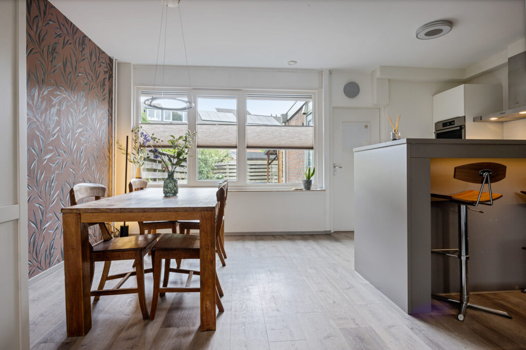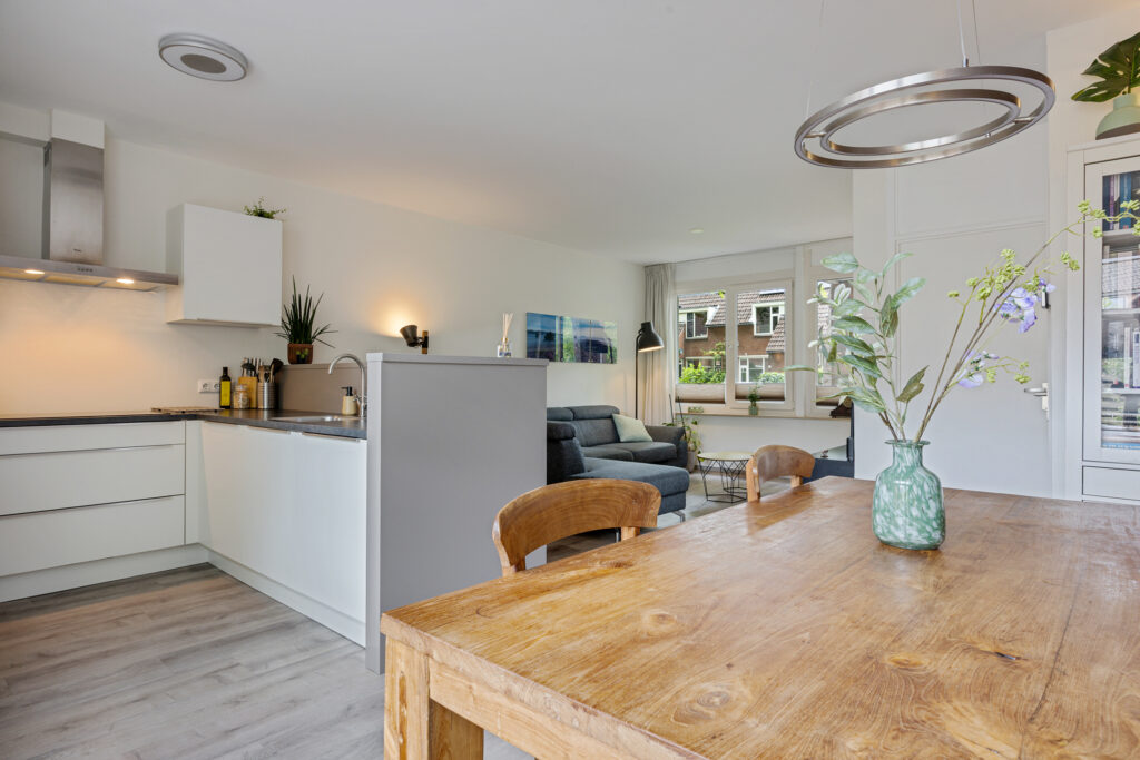 Aan de achterzijde ligt de halfopen keuken met bar en aangrenzende eetkamer. Deze vormen samen een open en sfeervol geheel, met uitzicht op het groen van de achtertuin. Vanuit de keuken is er toegang tot de bijkeuken, die tevens direct toegang biedt tot de tuin.