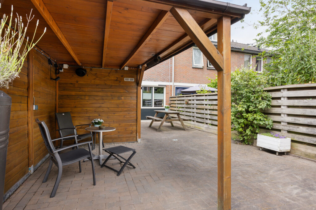 De achtertuin is gunstig gelegen op het zuiden en biedt de hele dag door zon. In de achtertuin staat een houten berging met overkapping en er is een handige achterom aanwezig.