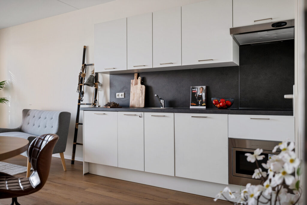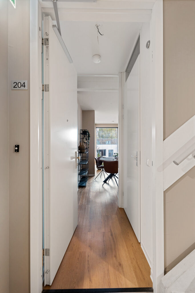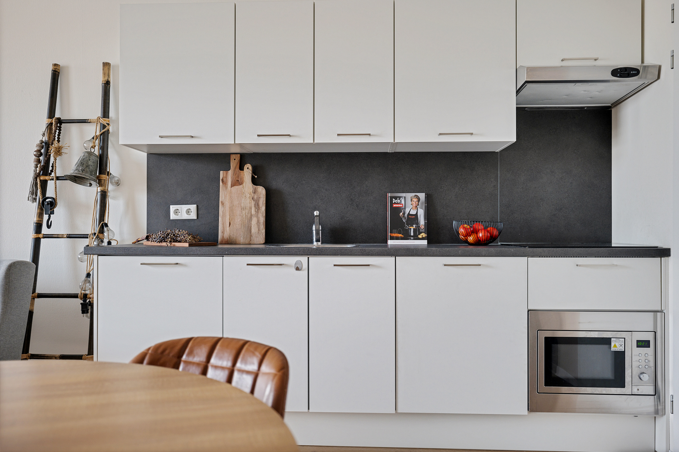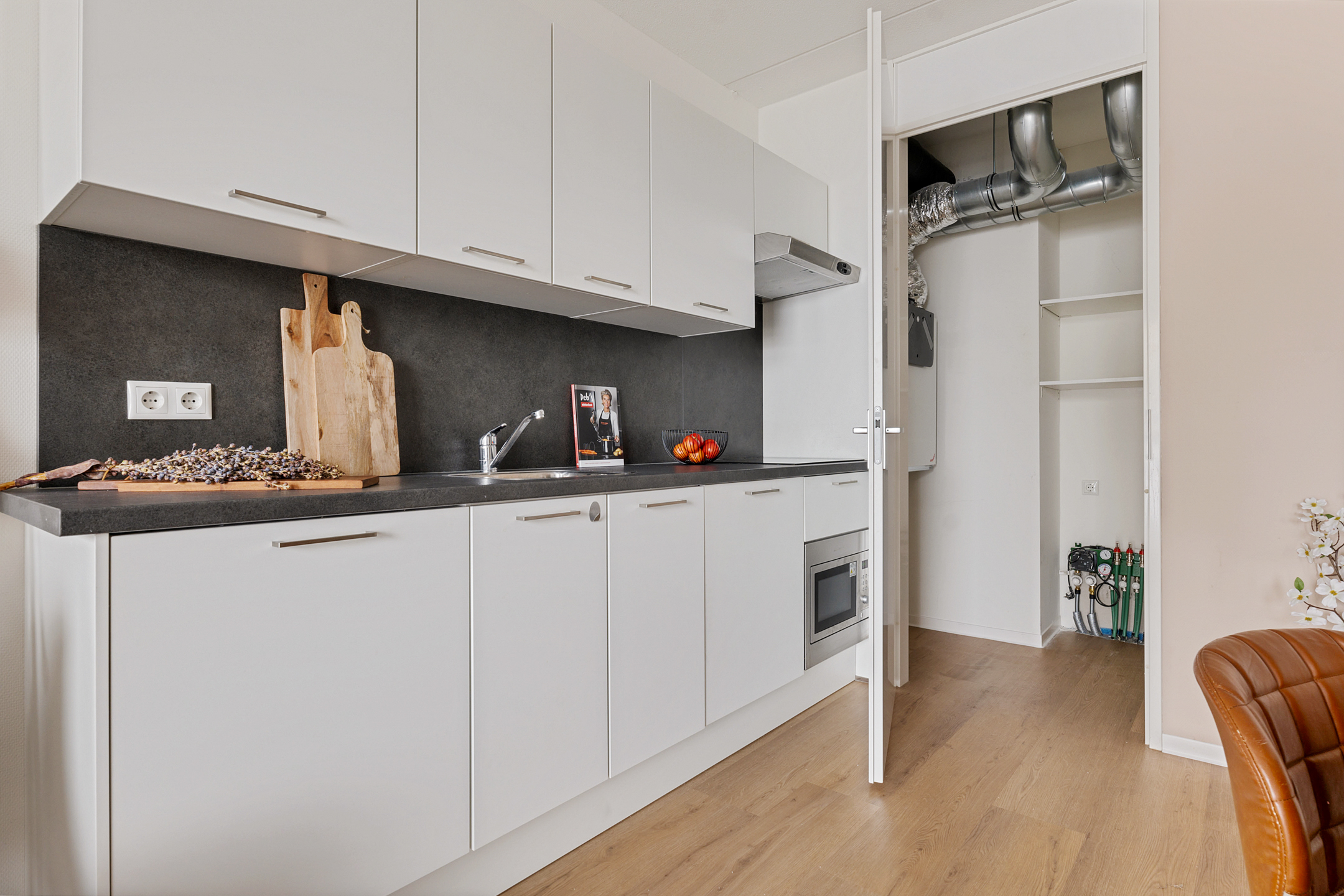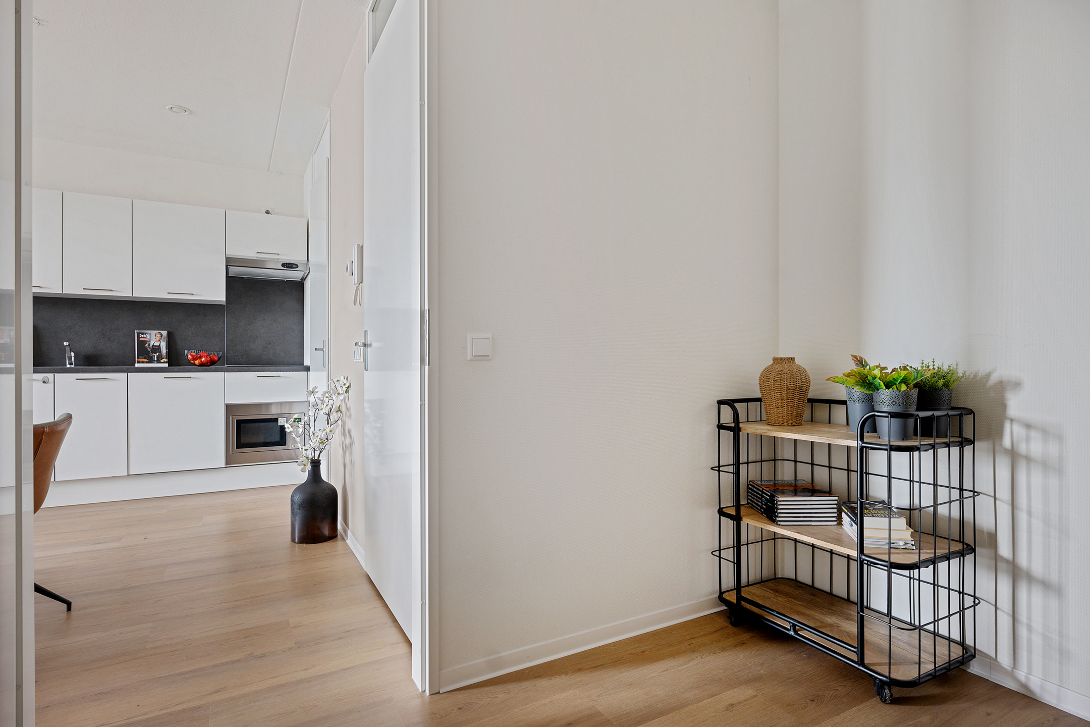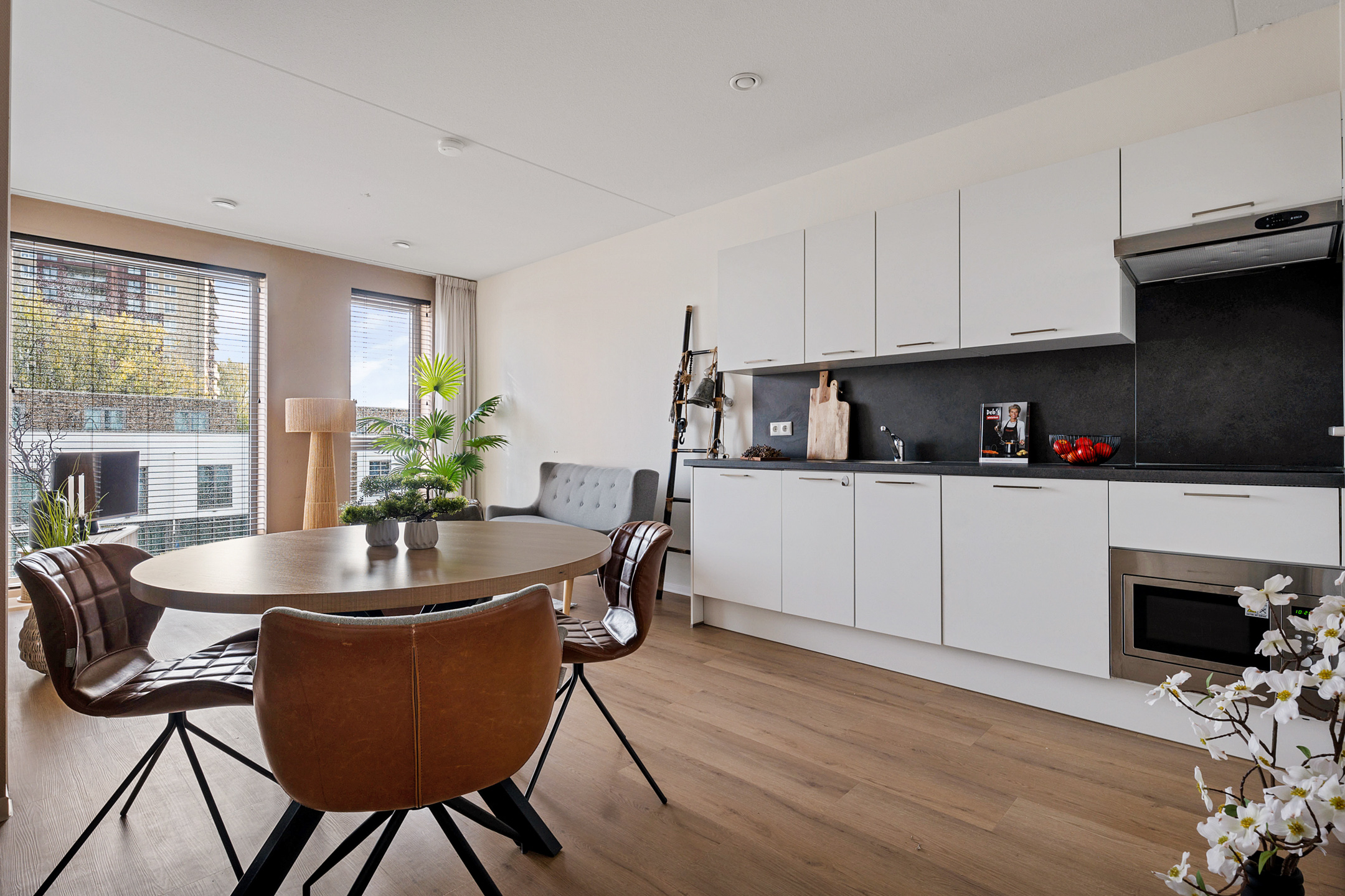Via de gezamenlijke entree met lift en trappenhuis bereik je het appartement op de derde verdieping. De hal biedt toegang tot de lichte woonkamer met open keuken en grote raampartijen die zorgen voor veel natuurlijk licht. De moderne keuken is voorzien van diverse inbouwapparatuur.