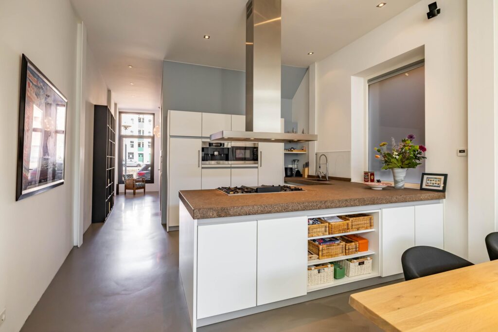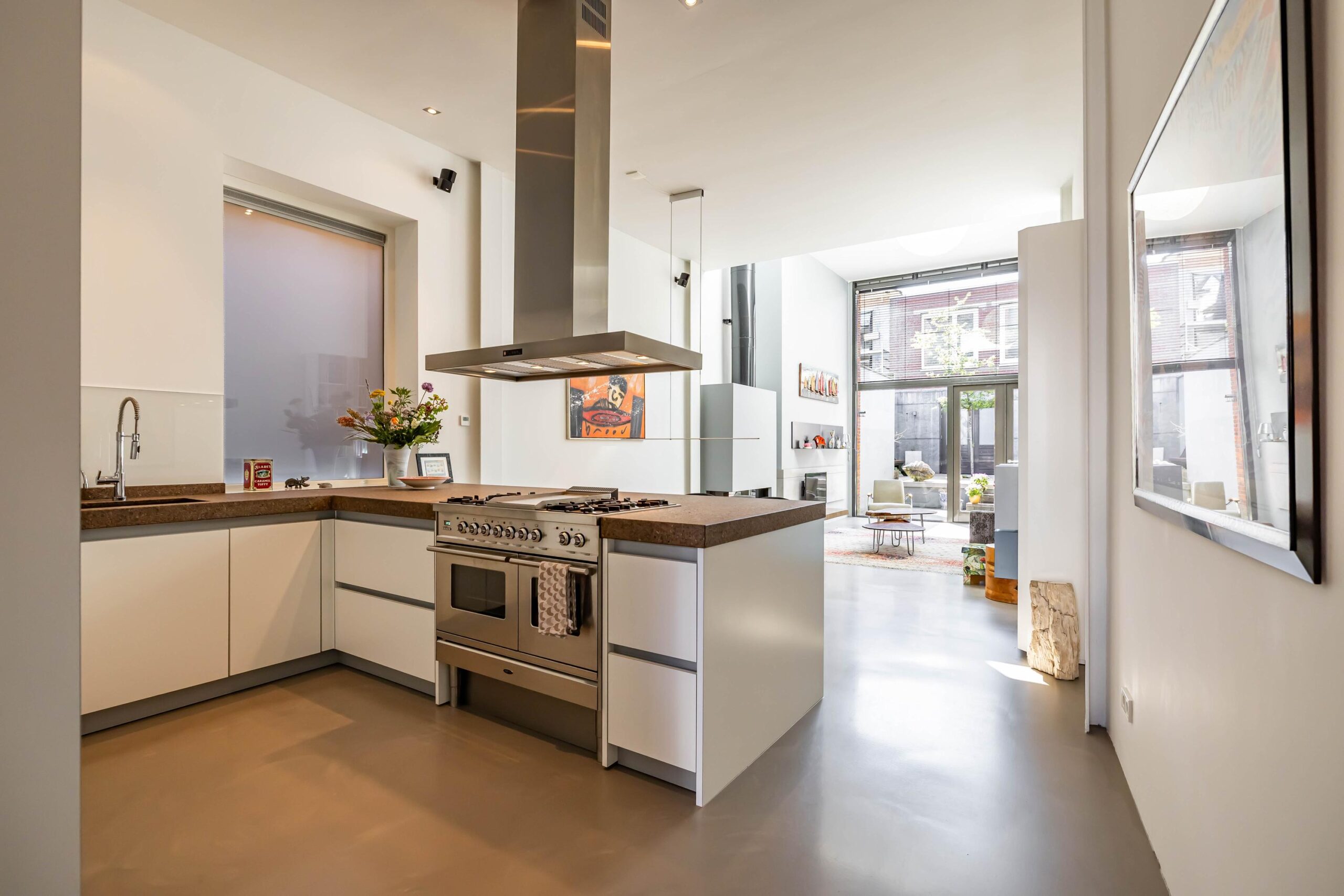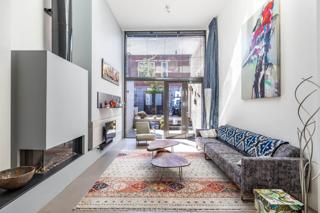 Binnen wacht een verbluffende woonbeleving. De imposante entree leidt naar een riante living van circa 50 m², met gashaard en luxe open keuken, compleet met kookeiland en Boretti-fornuis, recirculatie afzuigkap en composiet aanrechtblad. Dankzij de grote raampartijen en de uitzonderlijk hoge plafonds baadt elke verdieping in natuurlijk licht.
