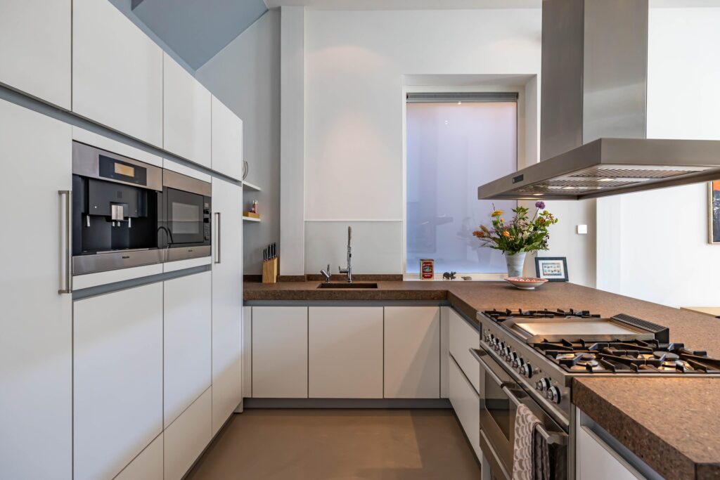 - Keuken met Boretti fornuis met oven (2x), inbouw Miele espressomachine, magnetron, vaatwasser en koelkast.