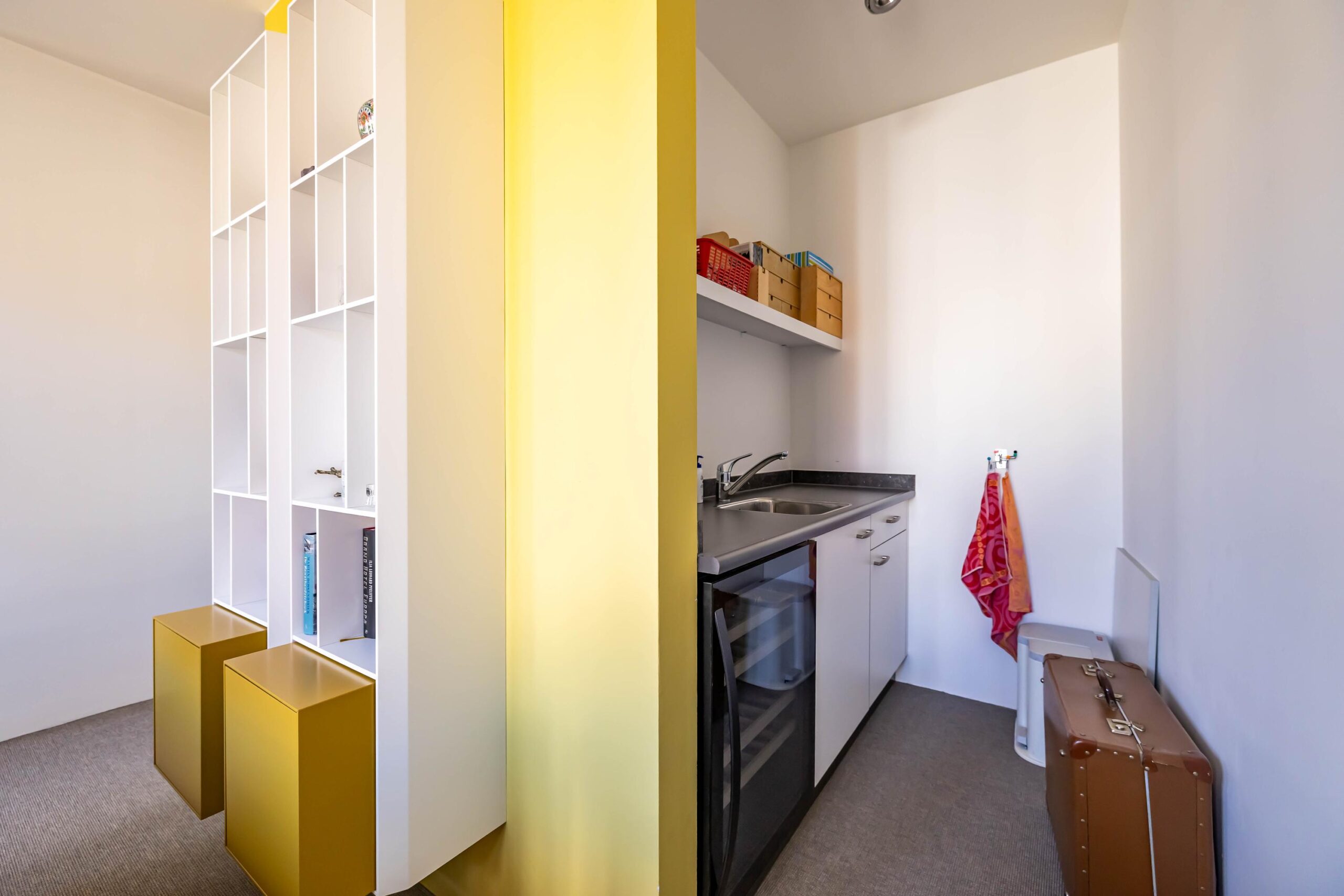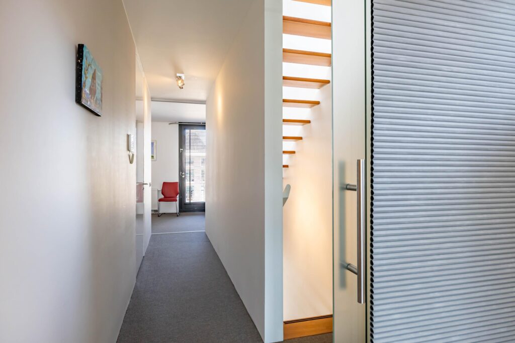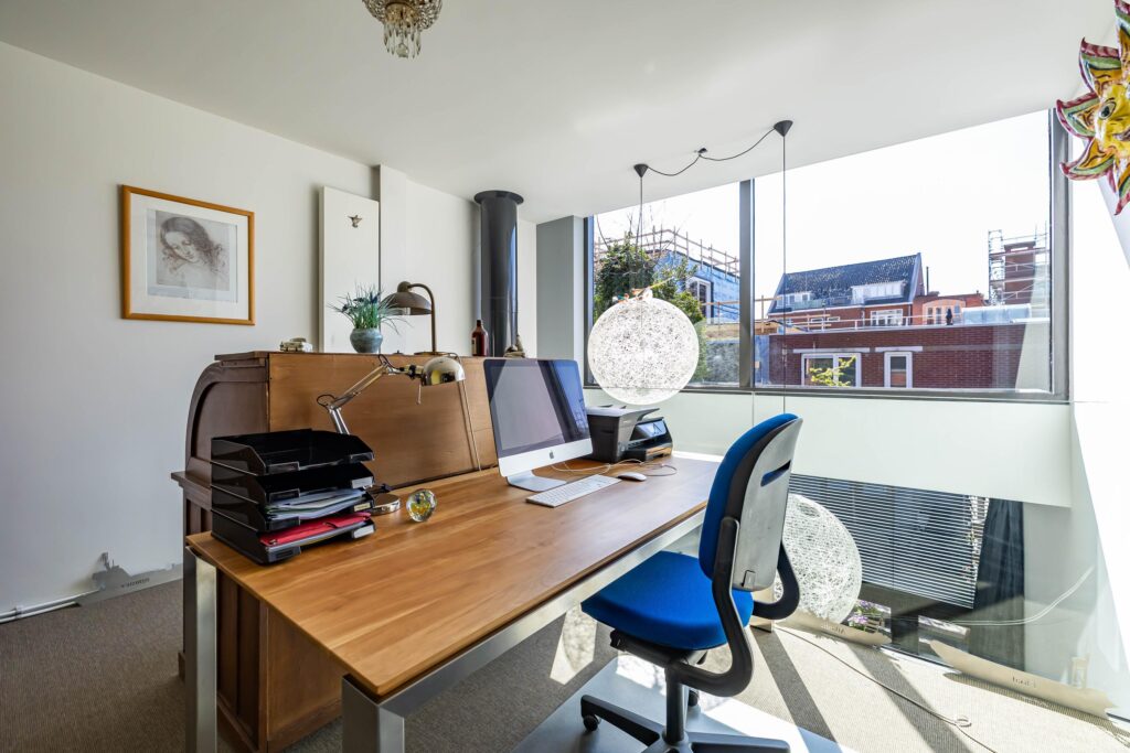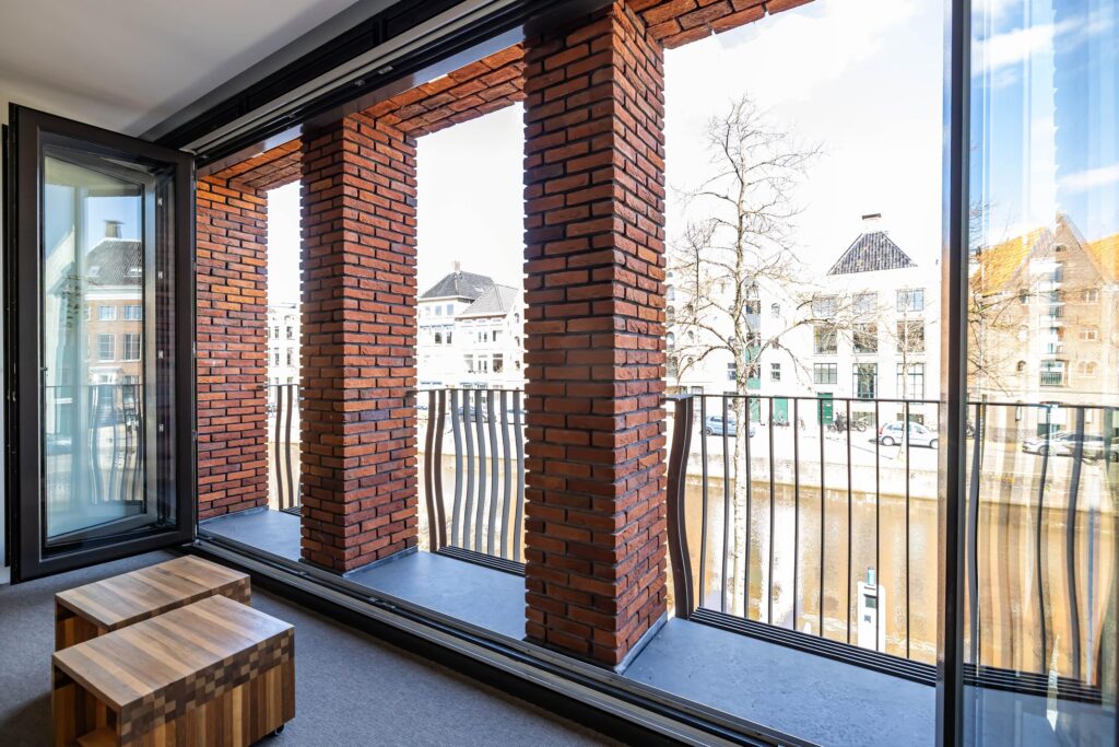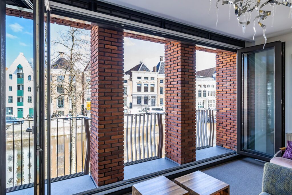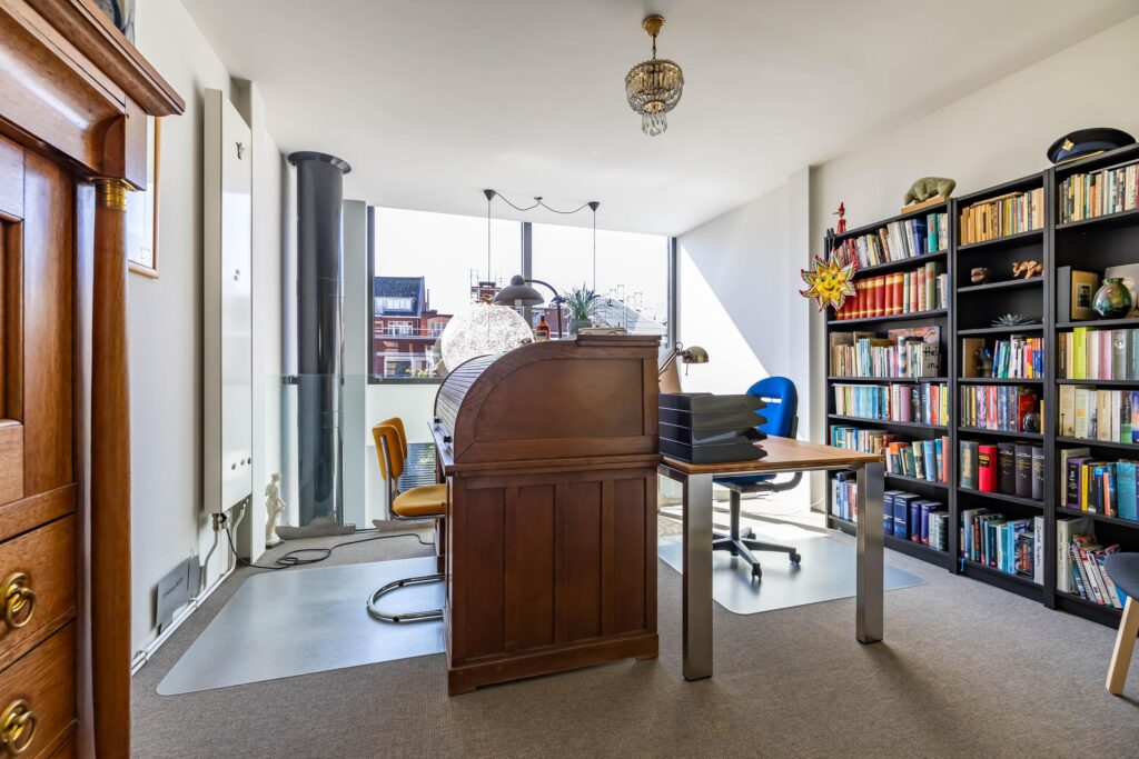 Ook hier is het bijzondere ontwerp van De Zwarte Hond weer duidelijk zichtbaar. Op de eerste verdieping aan de achterzijde van het pand bevindt zich een luxe en lichte werkkamer met vide. De zitkamer met pantry aan de voorzijde biedt o.a. door de te openen harmonica deuren het ultieme panorama: uitzicht op de iconische gevelwand van de Hoge der A en het kabbelende water van de A. Dit is het meest gefotografeerde stadsbeeld van Groningen — en u beleeft het dagelijks, vanuit uw eigen fauteuil.