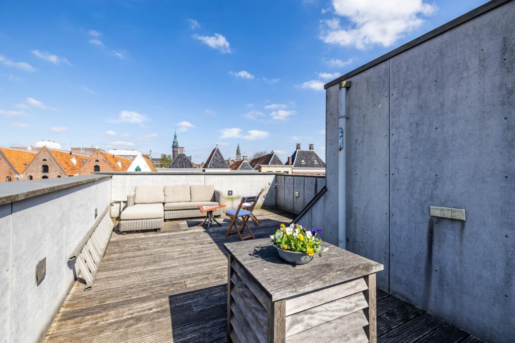 Maar er is meer. Dit moderne stadspaleis beschikt over een schitterende stadstuin van circa 40 m², een vrijstaande garage (met doorloop via de tuin naar het huis), én een dakterras van maar liefst ruim 50 m². Hier geniet u van een spectaculair uitzicht over de skyline van Groningen, met de Martinitoren, de A-kerk, de watertoren en de Universiteitstoren in het vizier.
