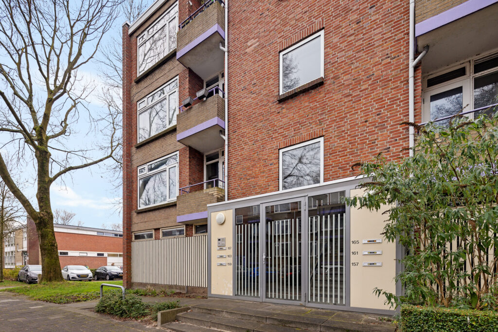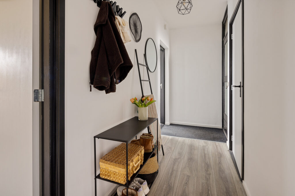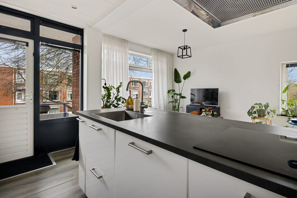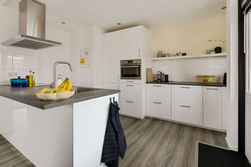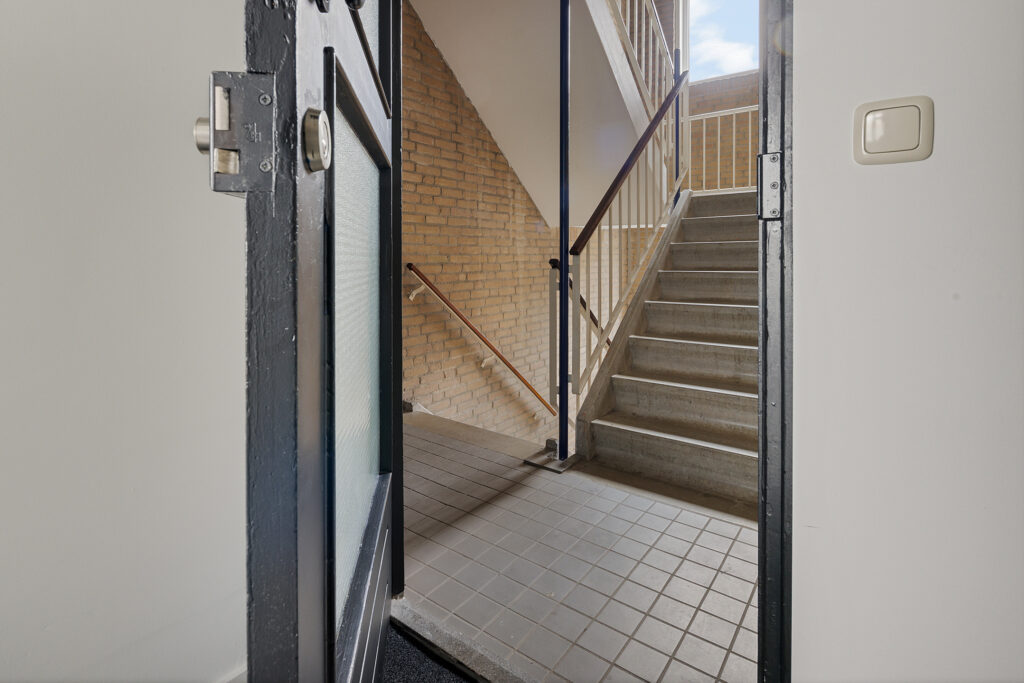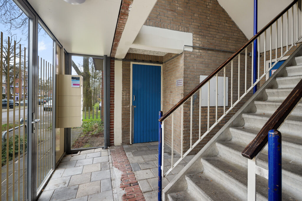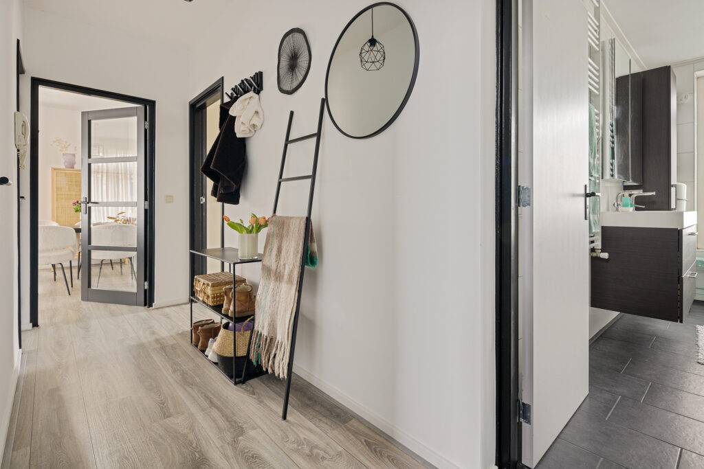 Via de portiek bereik je de entree van het appartement. De hal biedt toegang tot alle vertrekken en het toilet. De lichte en ruime woonkamer vormt samen met de open keuken een prettig leefgedeelte. Dankzij de grote raampartijen en de gedeeltelijk kunststof kozijnen met HR++ beglazing is er volop daglicht, wat zorgt voor een aangename en open sfeer. De keuken is modern uitgevoerd en praktisch ingericht, met voldoende werk- en kastruimte.