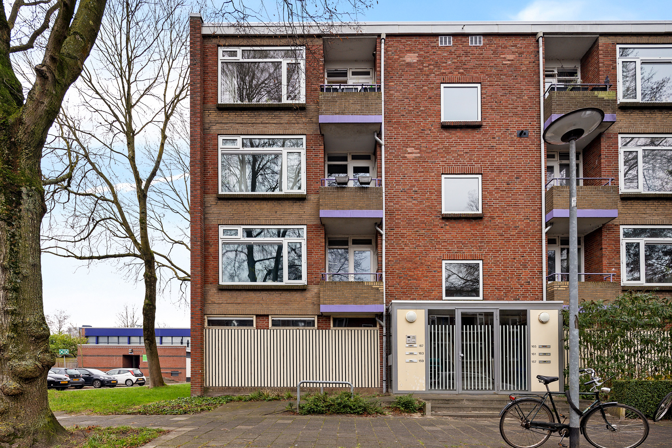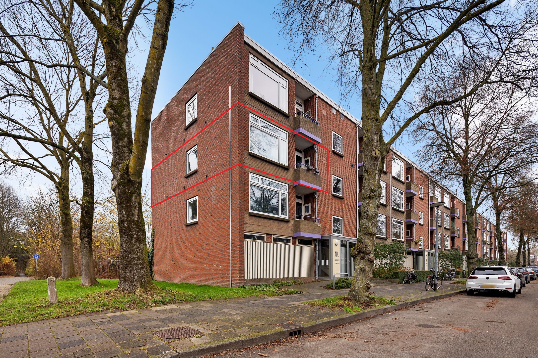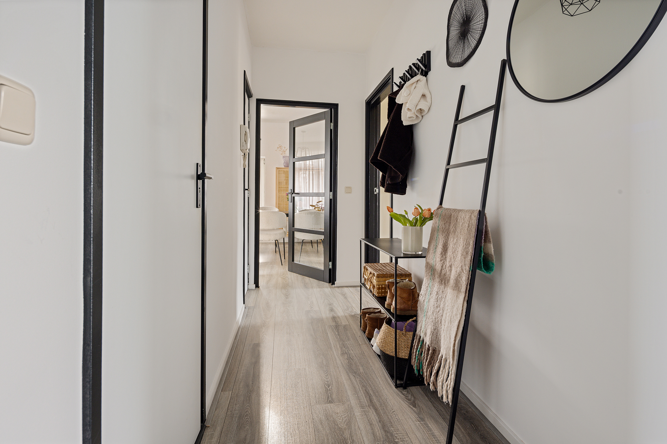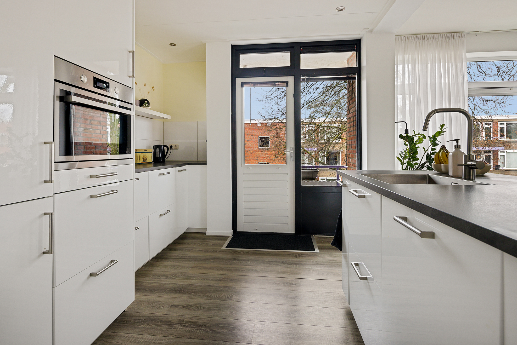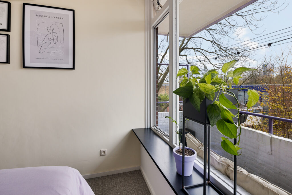 Via de portiek bereik je de entree van het appartement. De hal biedt toegang tot alle vertrekken en het toilet. De lichte en ruime woonkamer vormt samen met de open keuken een prettig leefgedeelte. Dankzij de grote raampartijen en de gedeeltelijk kunststof kozijnen met HR++ beglazing is er volop daglicht, wat zorgt voor een aangename en open sfeer. De keuken is modern uitgevoerd en praktisch ingericht, met voldoende werk- en kastruimte.