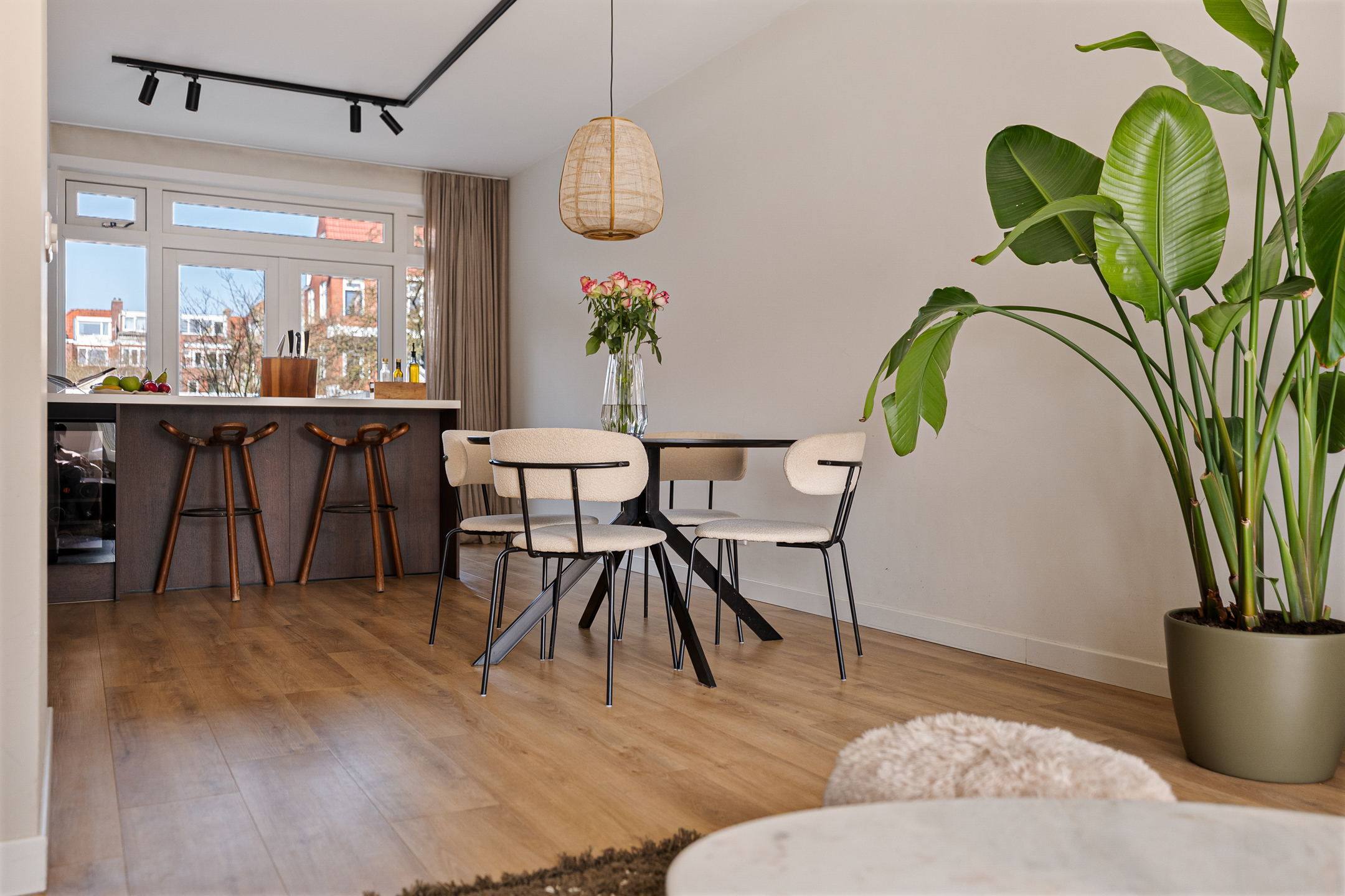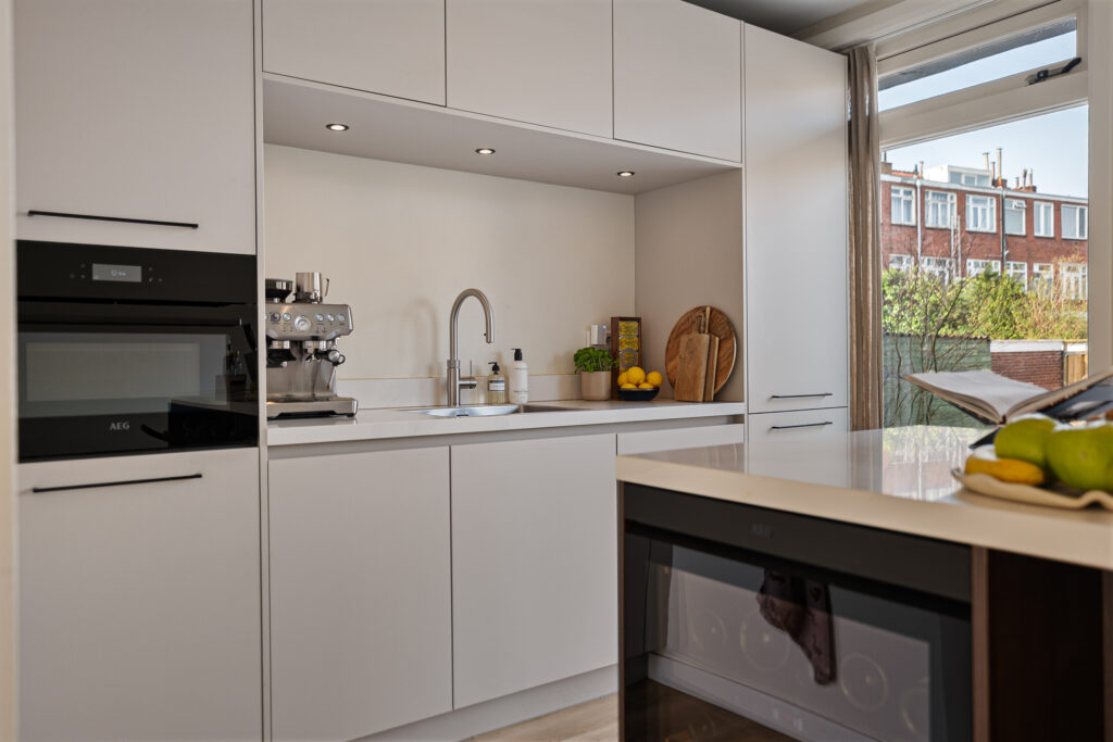 De woonkamer staat in open verbinding met de moderne woonkeuken (2024), waardoor een mooie, lichte en ruimtelijke leefruimte ontstaat. De keuken is ingericht met een kookeiland en diverse inbouwapparatuur, waaronder een kookplaat, combi-oven, vaatwasser, koel-vriescombinatie, klimaatkast en een Quooker. Vanuit de keuken is er direct toegang tot de tuin.