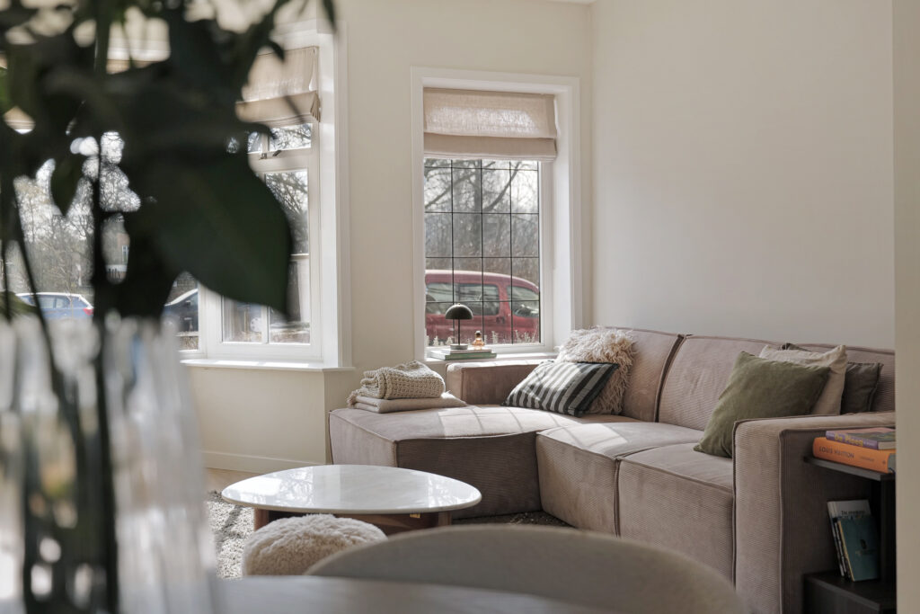 Aan het einde van de hal bereik je de lichte woonkamer aan de voorzijde van de woning. Dankzij de grote raampartijen valt hier veel daglicht naar binnen en is er volop ruimte voor een comfortabele zit- en eethoek.