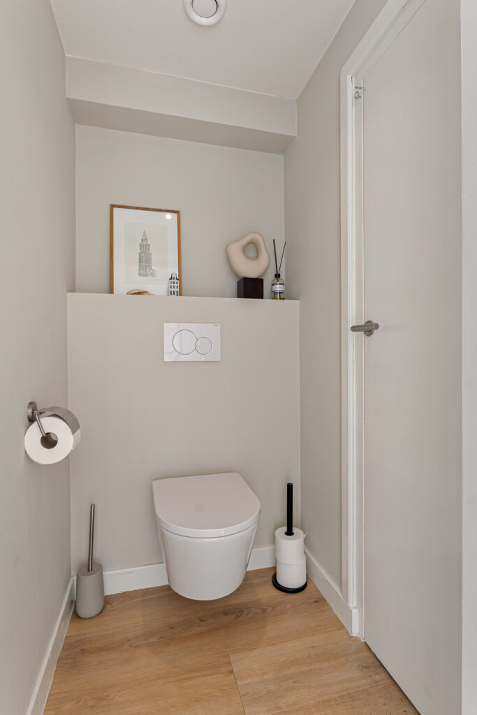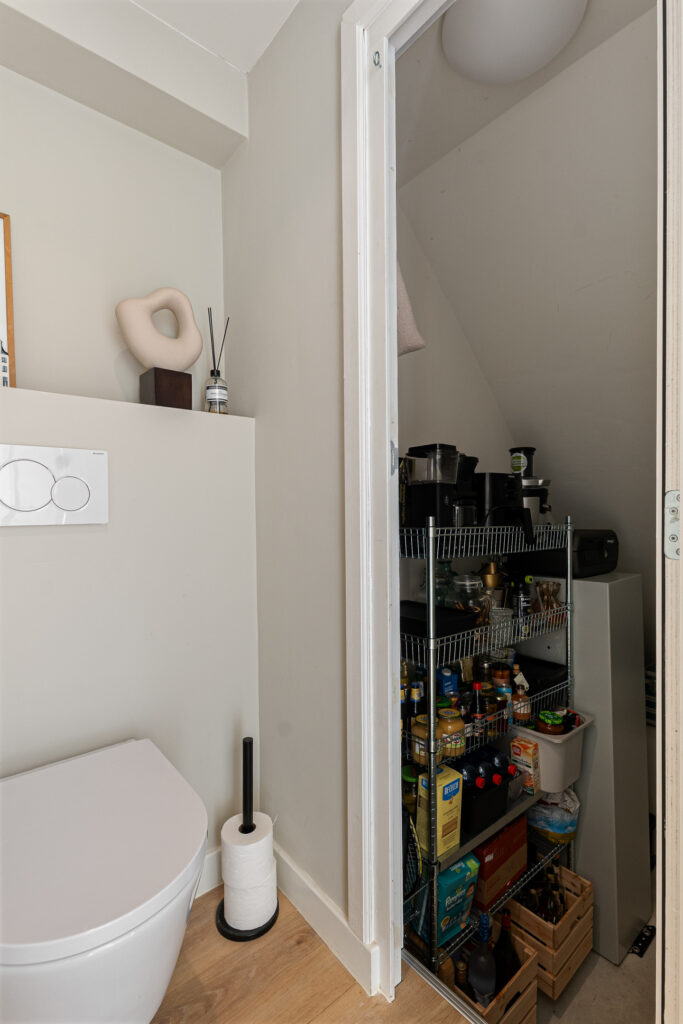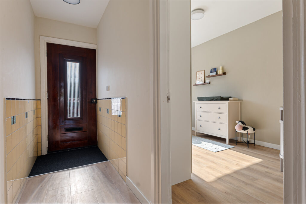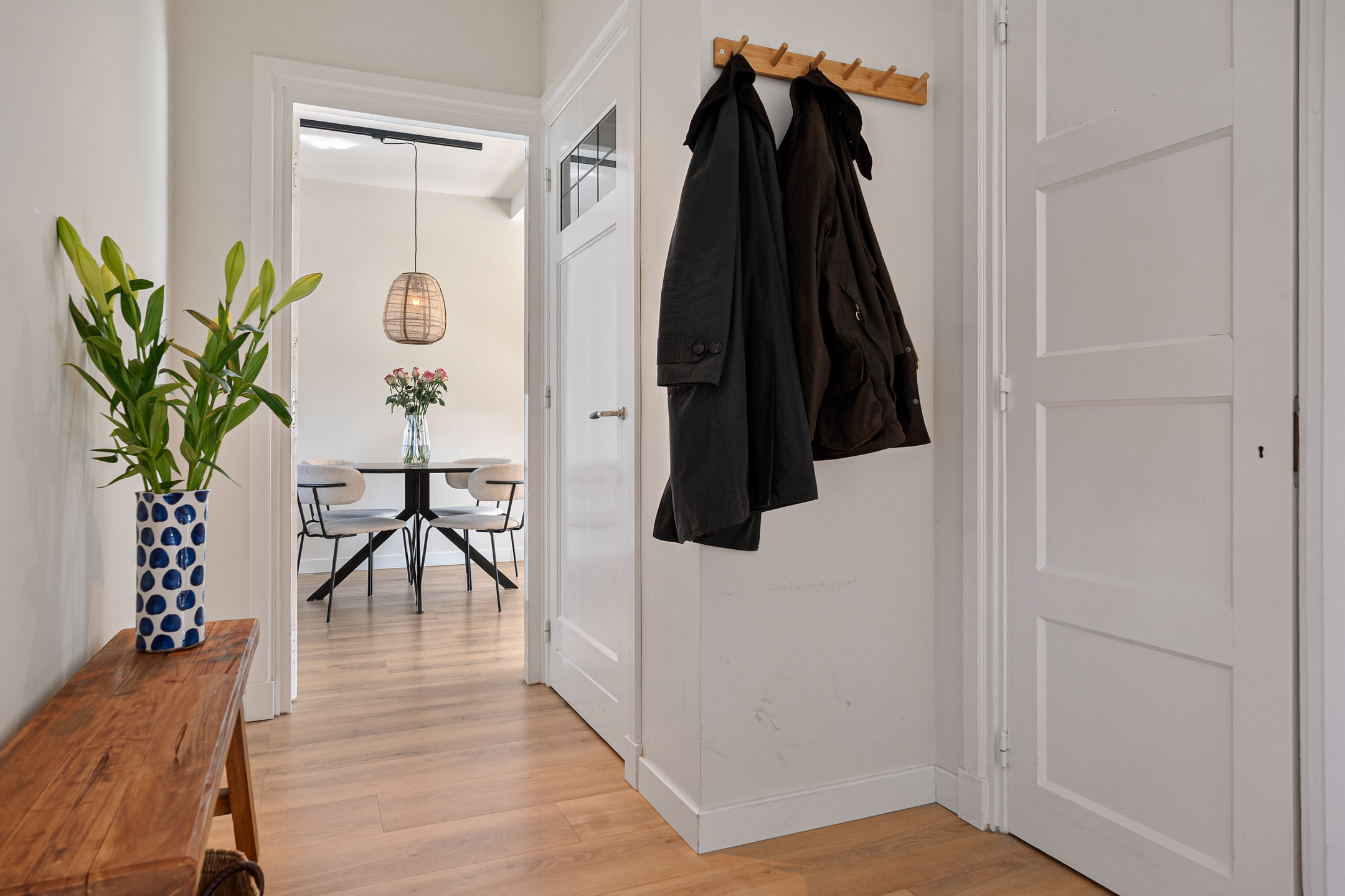 Via de entree kom je binnen in de hal, die toegang biedt tot de meterkast en het toilet met aangrenzende bergkast. Vanuit de hal zijn de verschillende vertrekken van de woning bereikbaar. Direct links van de hal bevindt zich de eerste slaapkamer. Deze kamer is van goed formaat en geschikt als slaap-, werk- of logeerkamer.