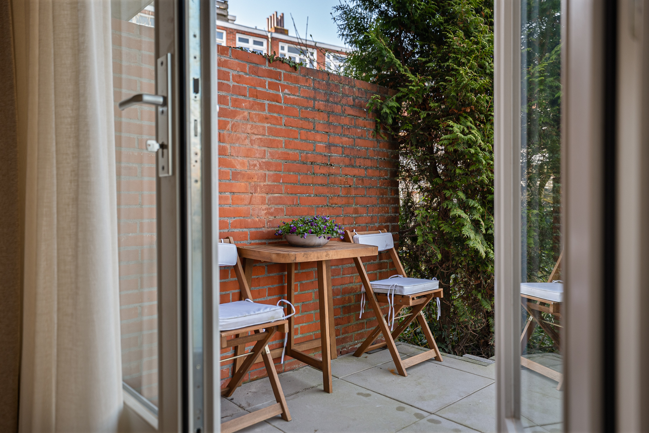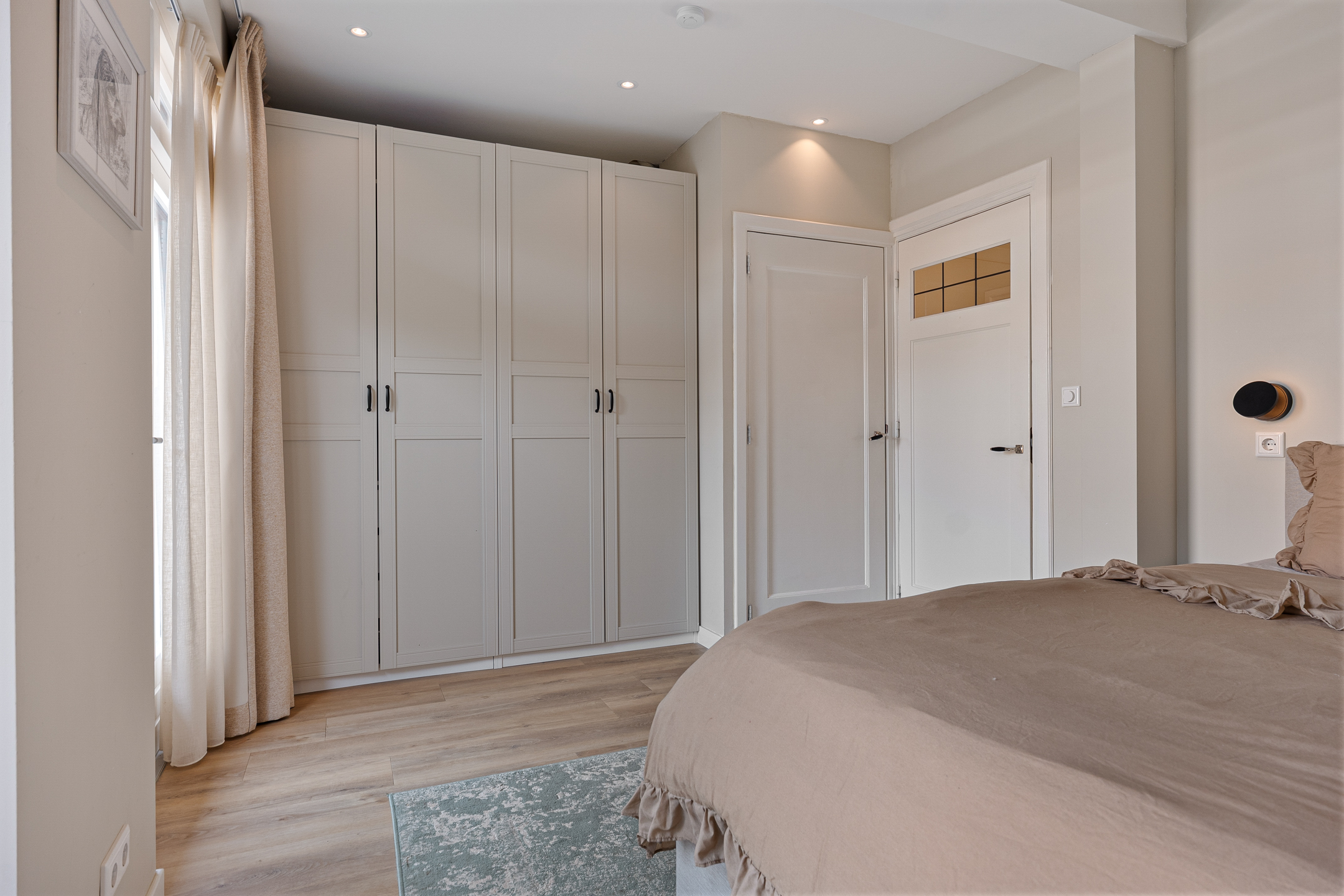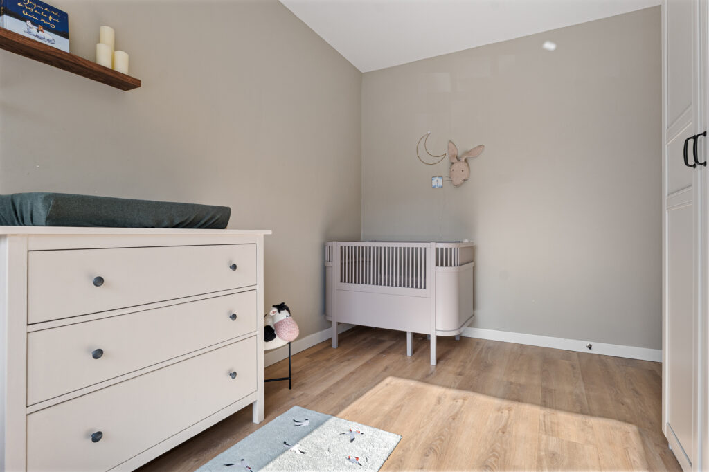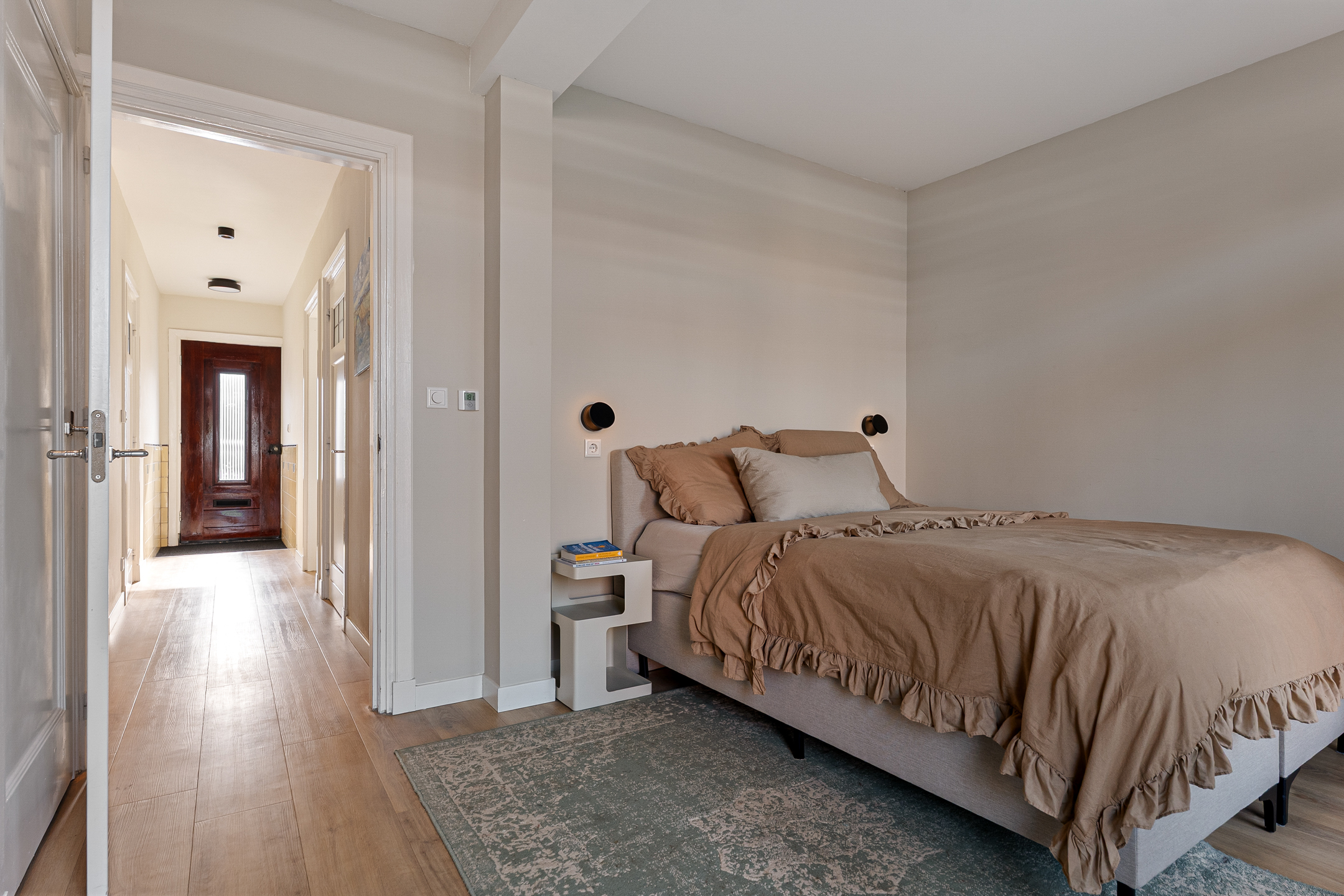 Recht vooruit, aan de achterzijde van de woning, bevindt zich de tweede slaapkamer. Deze ruime kamer beschikt over openslaande deuren naar de tuin, waardoor binnen en buiten mooi met elkaar verbonden worden.