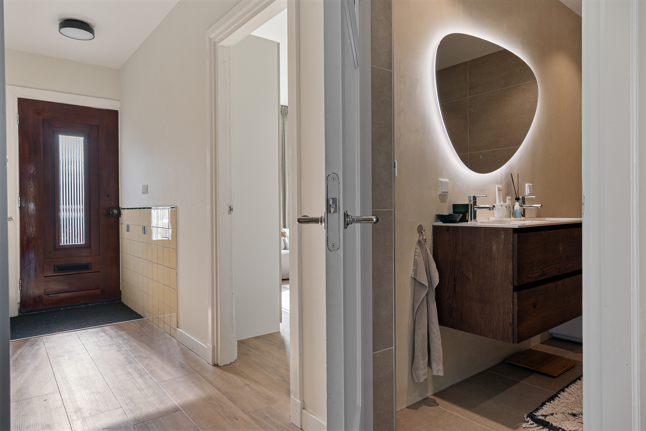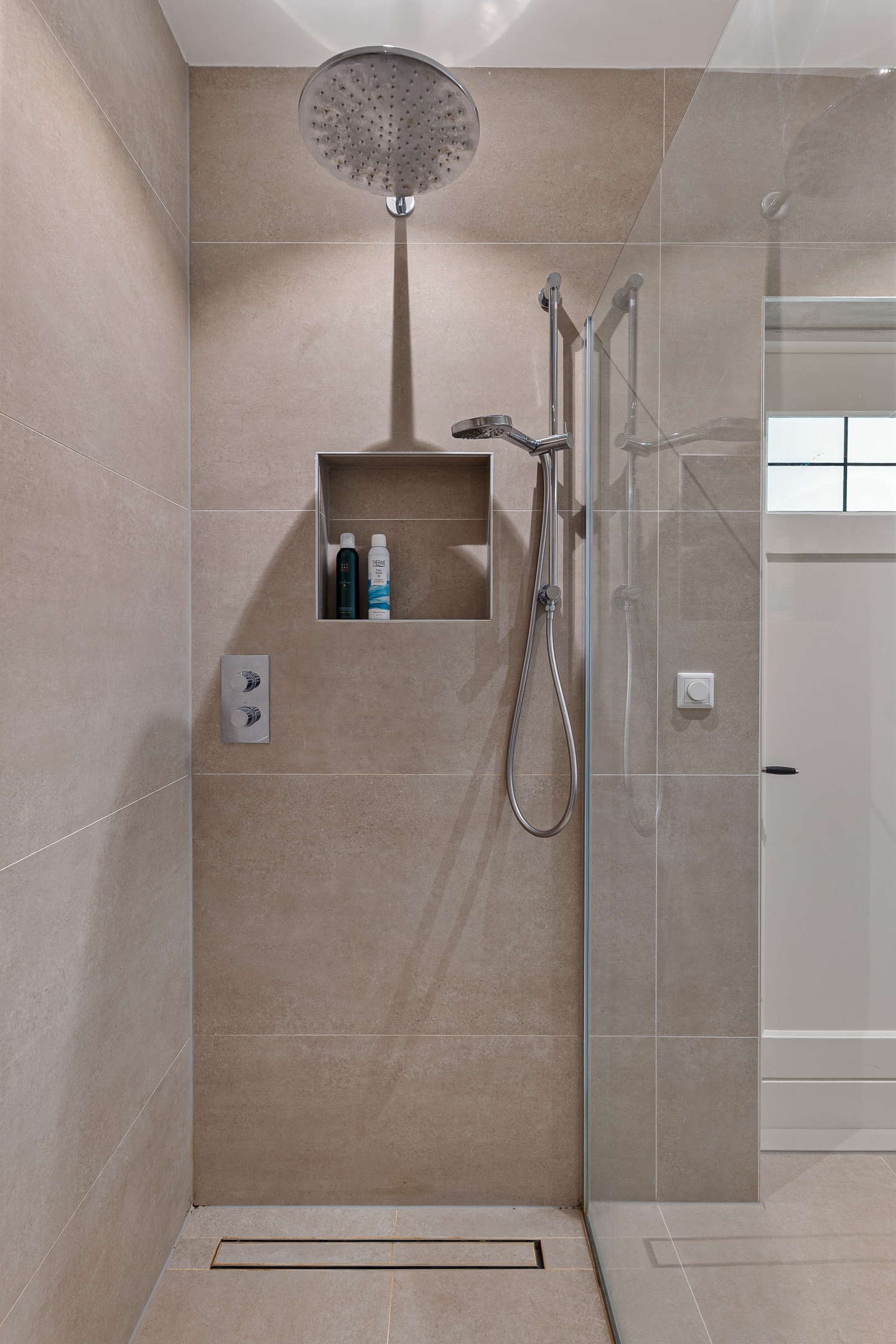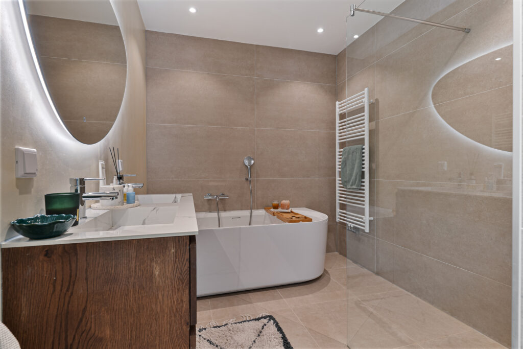 De tweede deur aan de linkerzijde leidt naar de moderne badkamer (2024), die compleet is uitgevoerd met een ligbad, een ruime inloopdouche en een wastafelmeubel met dubbele wasbak. Net als de rest van de woning is ook de badkamer voorzien van comfortabele vloerverwarming.