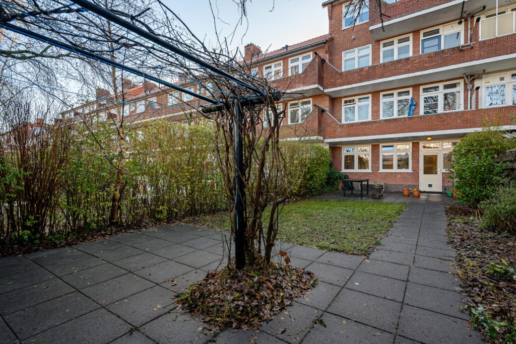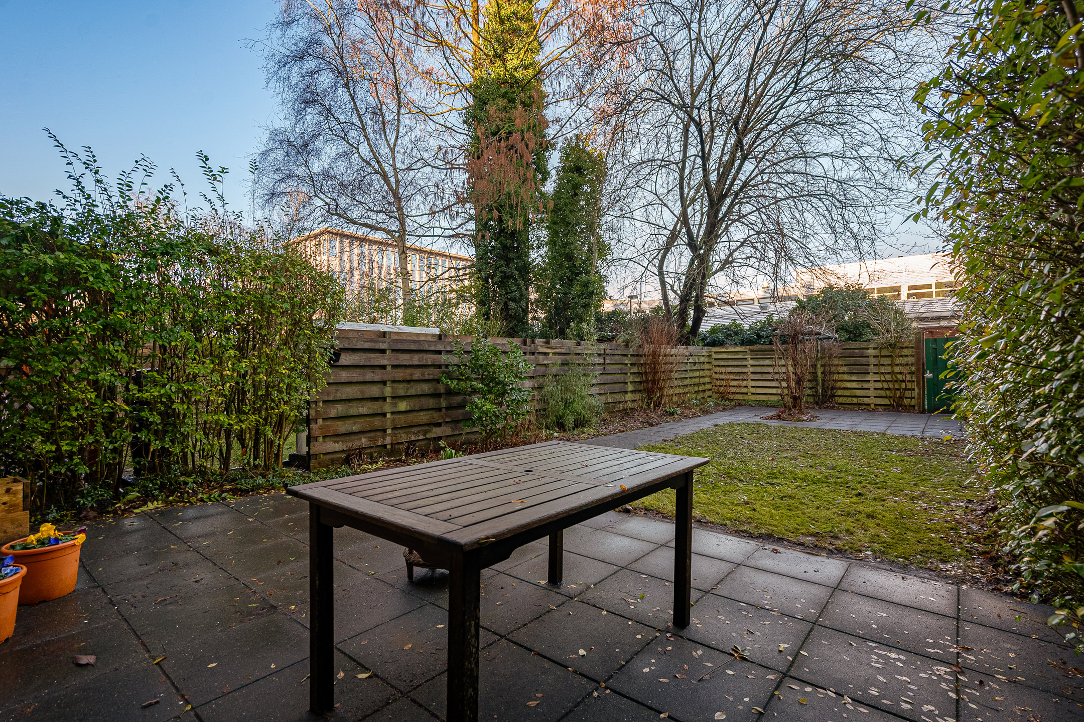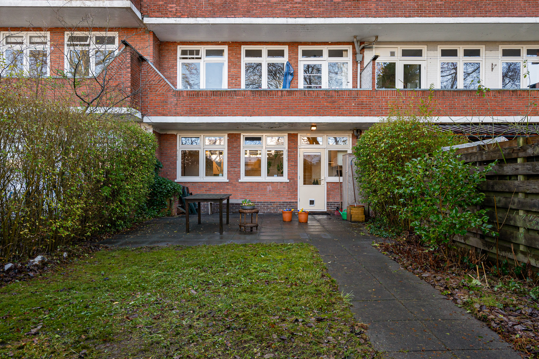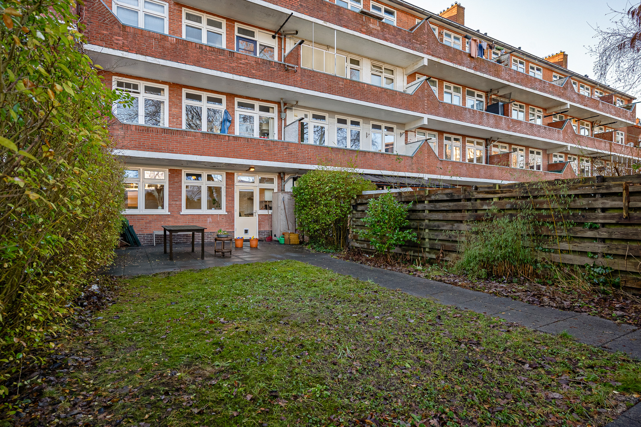 De achtertuin is met ca. 102 m² uitzonderlijk ruim voor een benedenwoning en is ca. 15 meter diep. Dankzij de diepte en ligging (noord) zijn er meerdere mogelijkheden om zitplekken te creëren. De tuin beschikt over afgesloten achterom met toegang tot een stenen berging, voor extra opslagruimte.