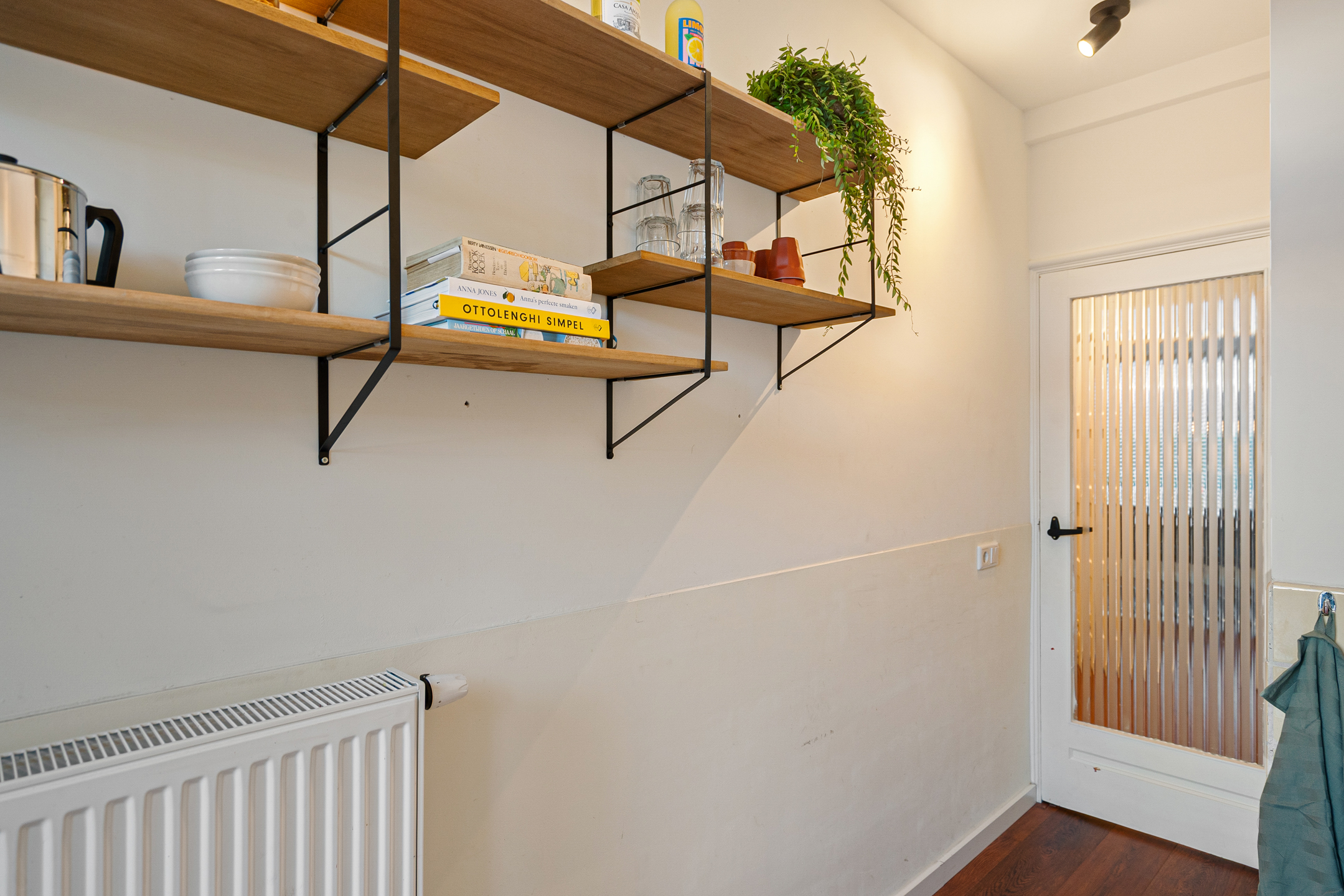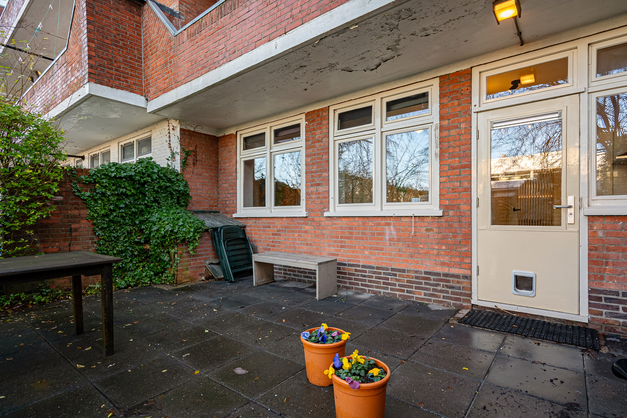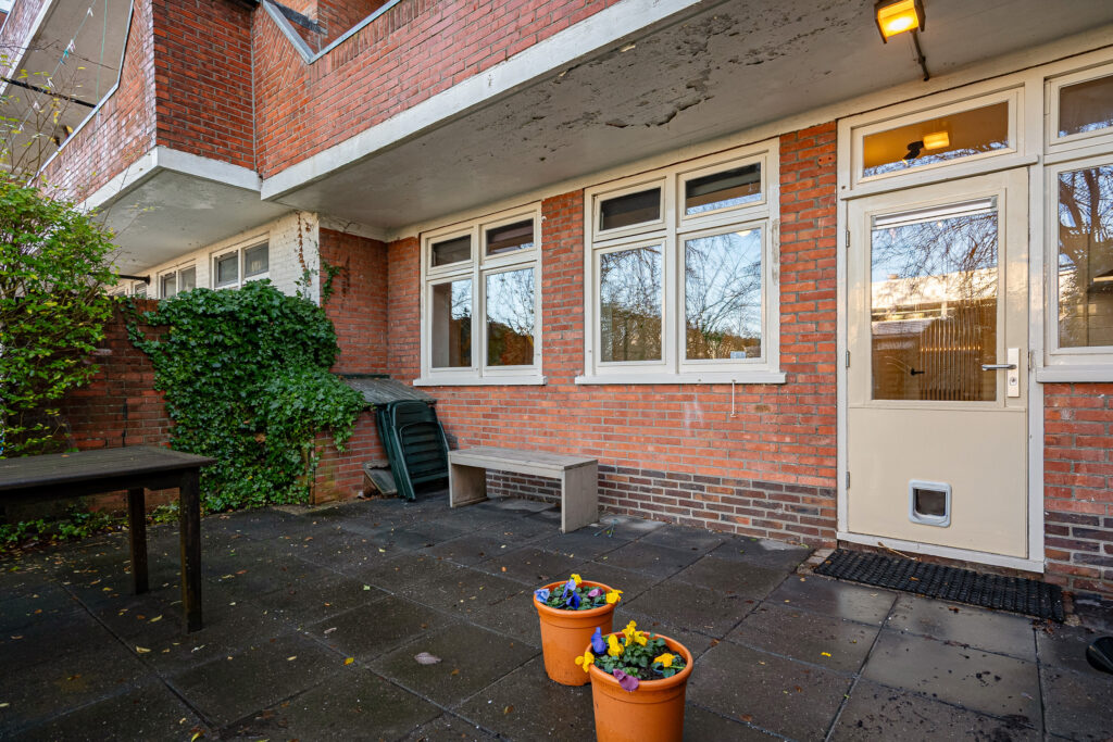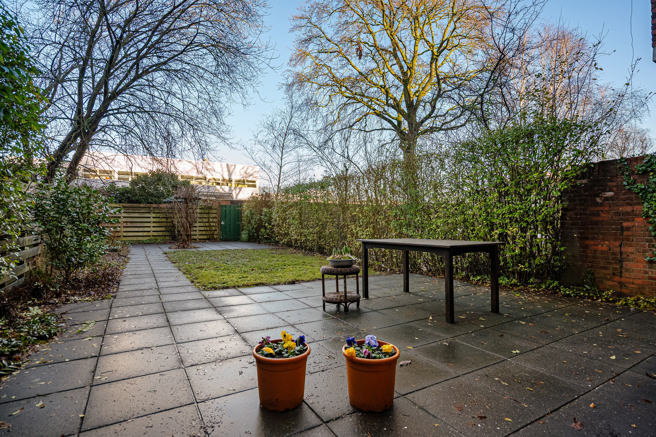 De achtertuin is met ca. 102 m² uitzonderlijk ruim voor een benedenwoning en is ca. 15 meter diep. Dankzij de diepte en ligging (noord) zijn er meerdere mogelijkheden om zitplekken te creëren. De tuin beschikt over afgesloten achterom met toegang tot een stenen berging, voor extra opslagruimte.