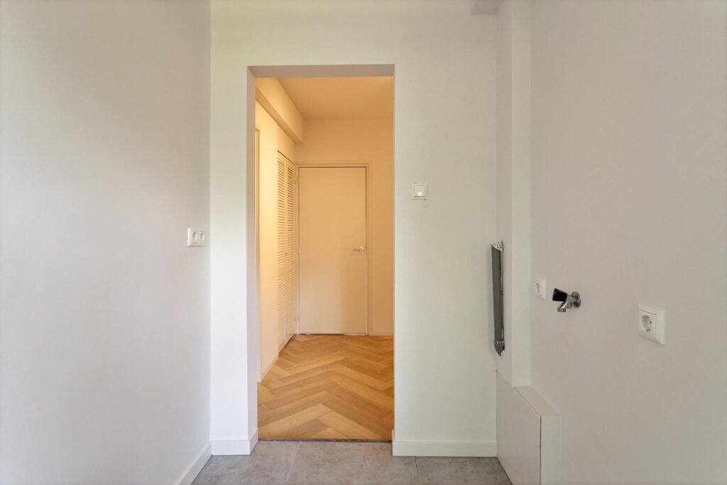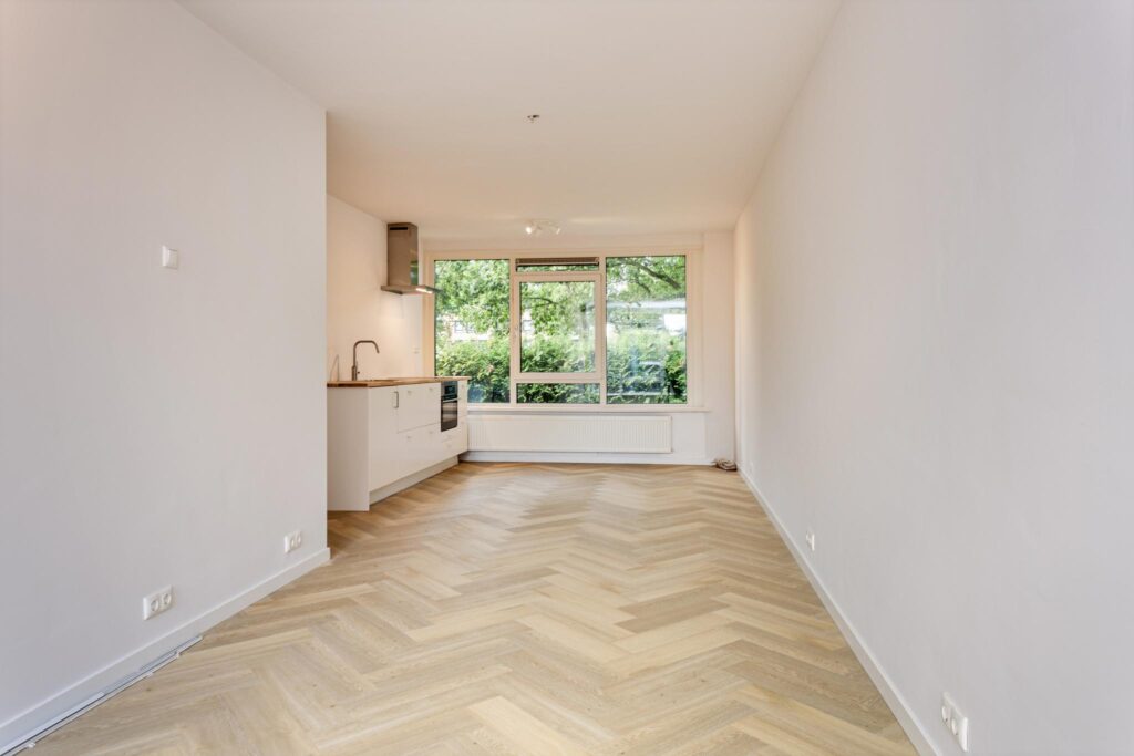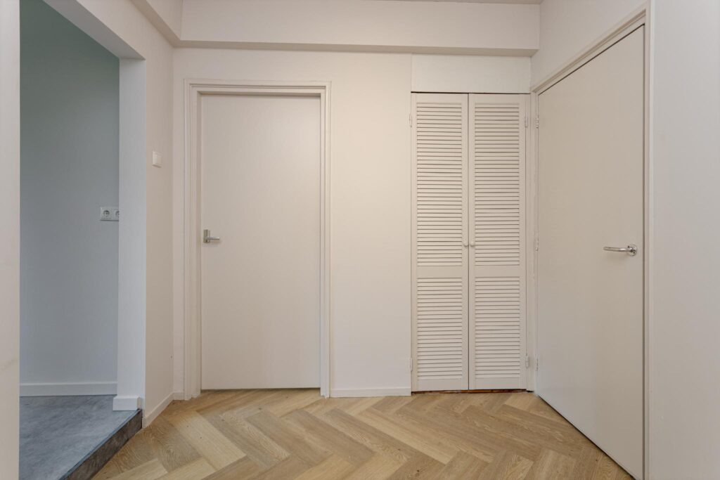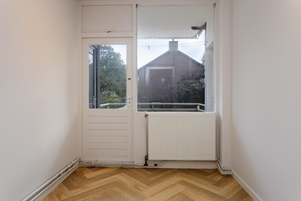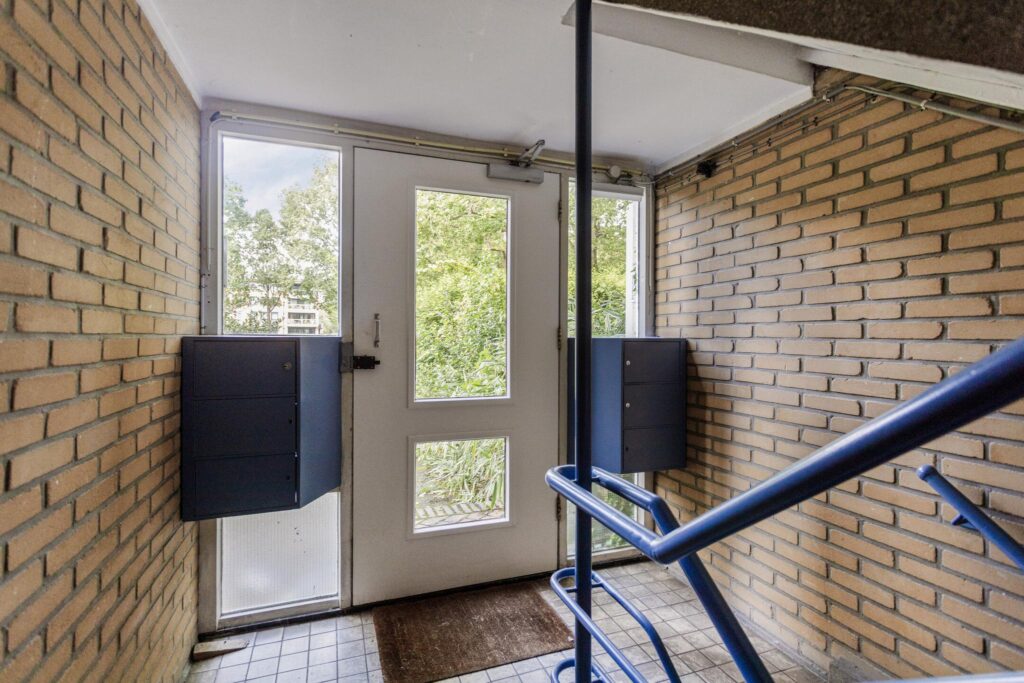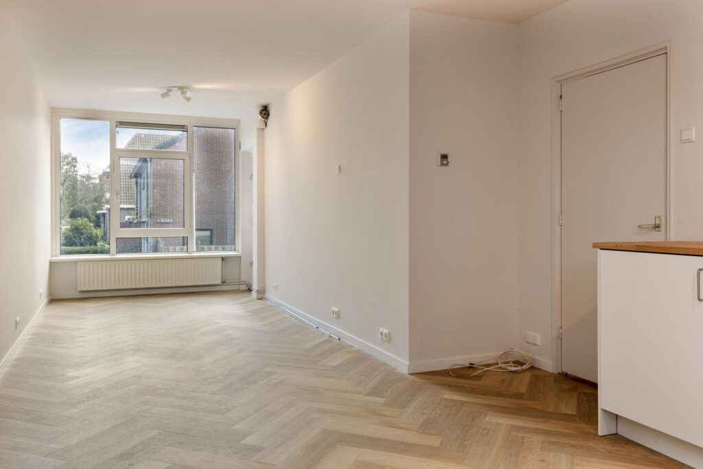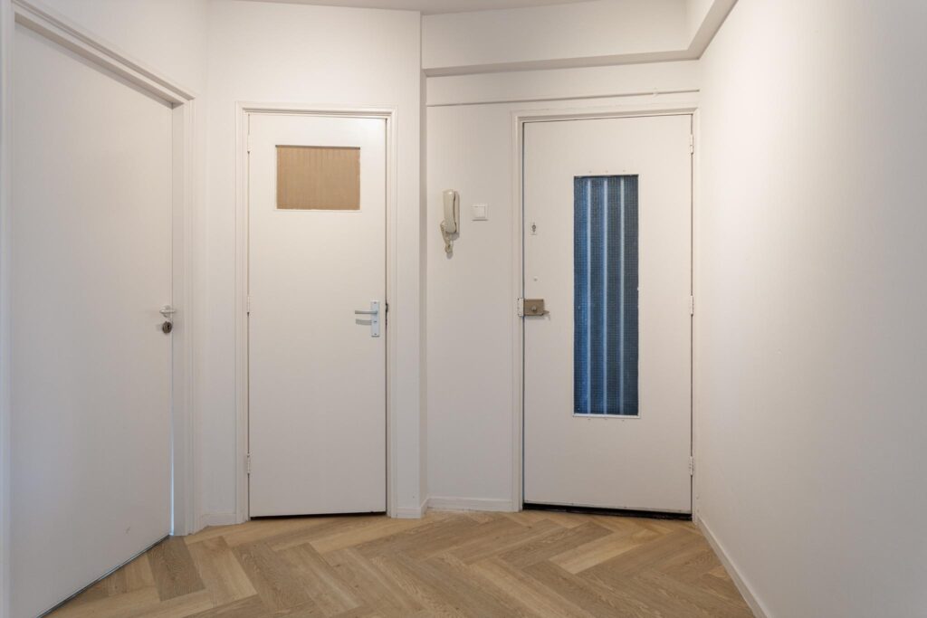 De indeling bestaat uit een hal met gemoderniseerd toilet, en een stook- annex bergkast. De beide slaapkamers zijn aan de achterzijde gesitueerd en leiden beiden naar één van de balkons. De doorzon woonkamer sluit ook aan op dit balkon, maar ook op die aan de straatzijde. Daarnaast beschikt de woonkamer over een open - moderne - keuken. Het geheel wordt gecompleteerd door een eveneens gemoderniseerde badkamer.