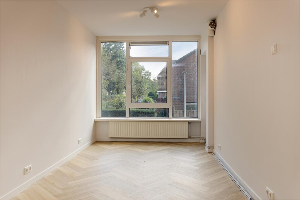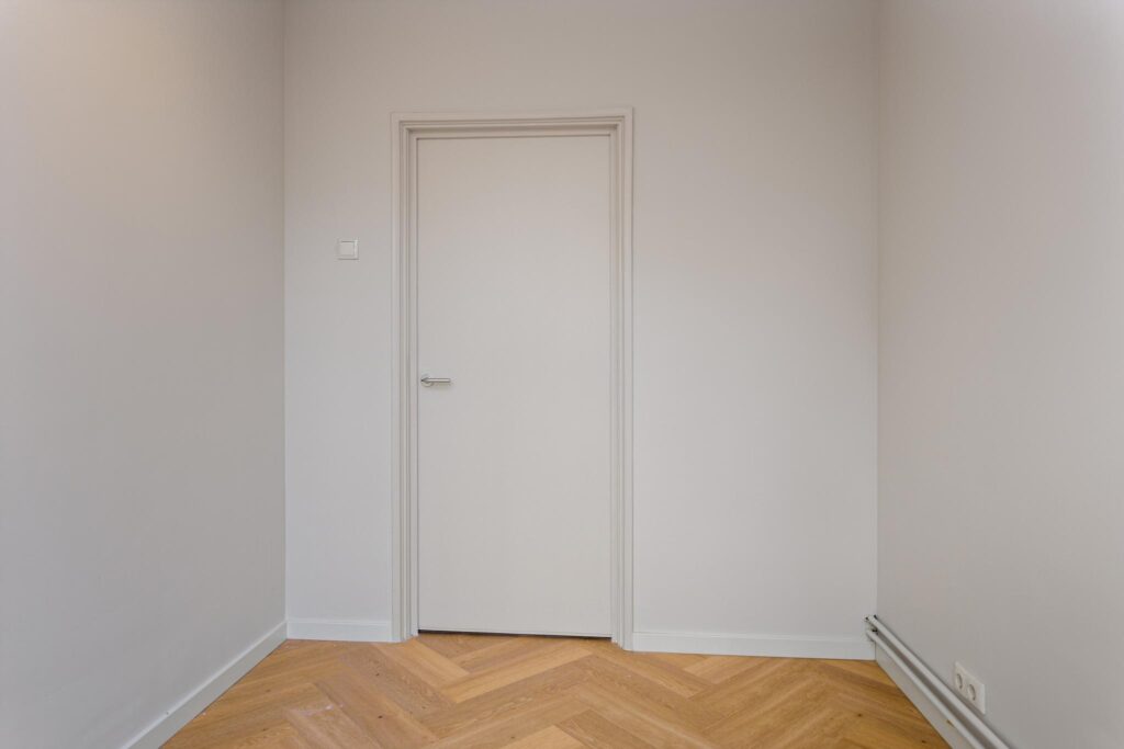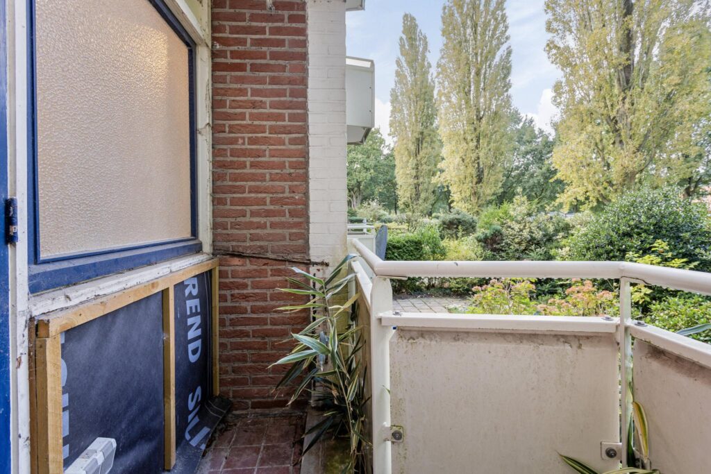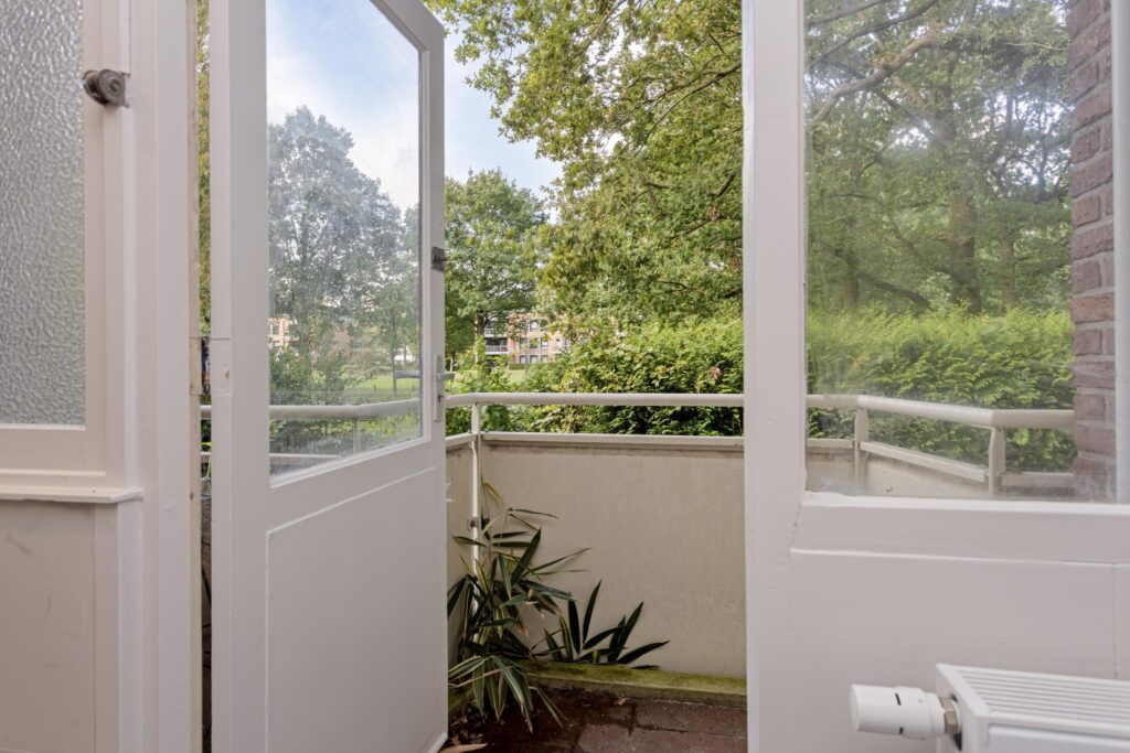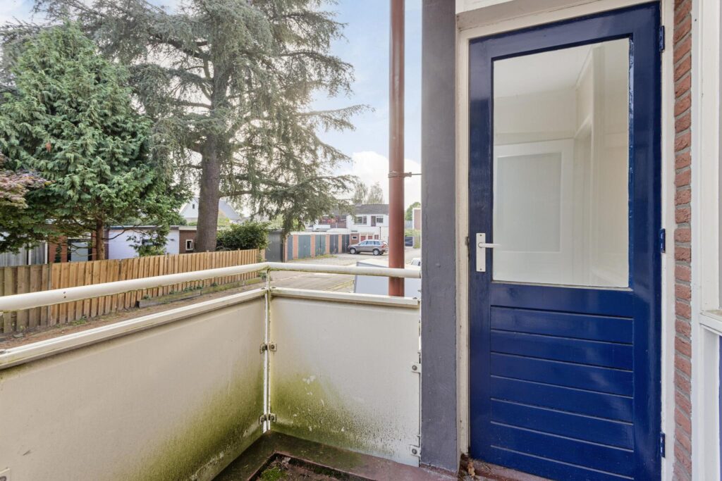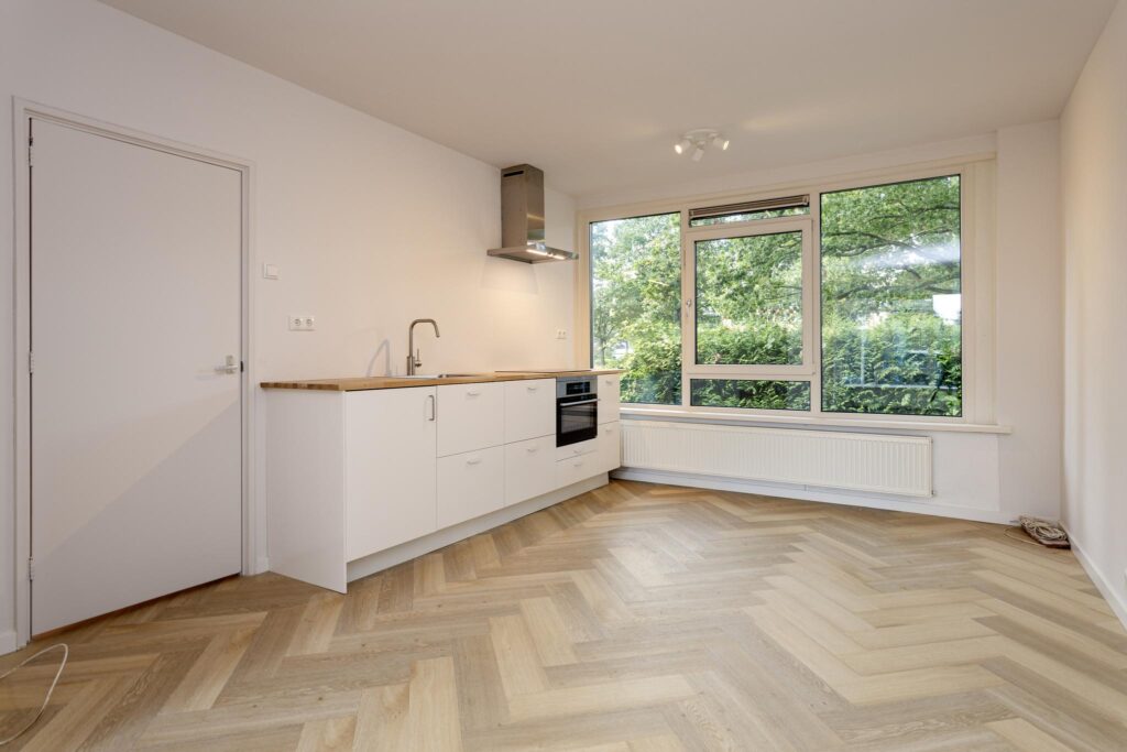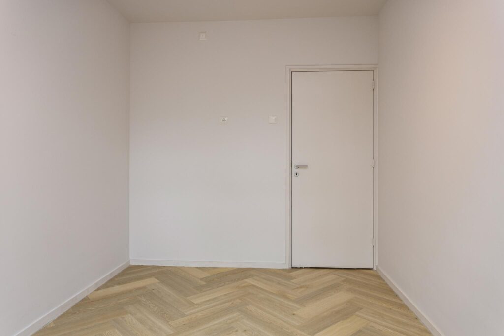 De indeling bestaat uit een hal met gemoderniseerd toilet, en een stook- annex bergkast. De beide slaapkamers zijn aan de achterzijde gesitueerd en leiden beiden naar één van de balkons. De doorzon woonkamer sluit ook aan op dit balkon, maar ook op die aan de straatzijde. Daarnaast beschikt de woonkamer over een open - moderne - keuken. Het geheel wordt gecompleteerd door een eveneens gemoderniseerde badkamer.