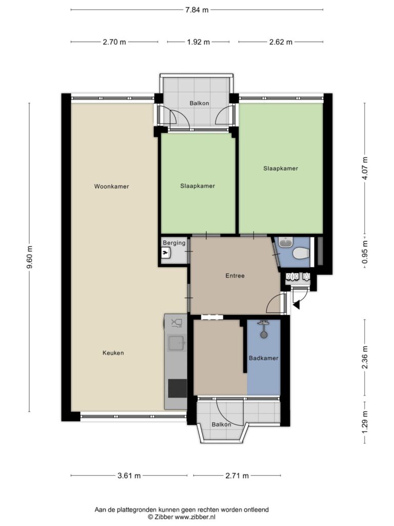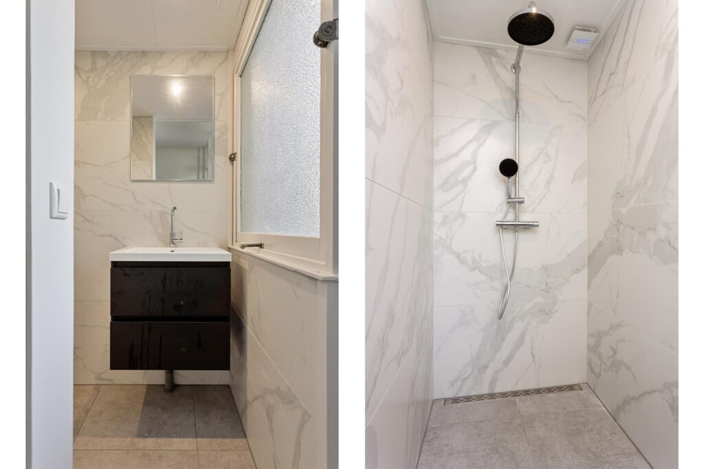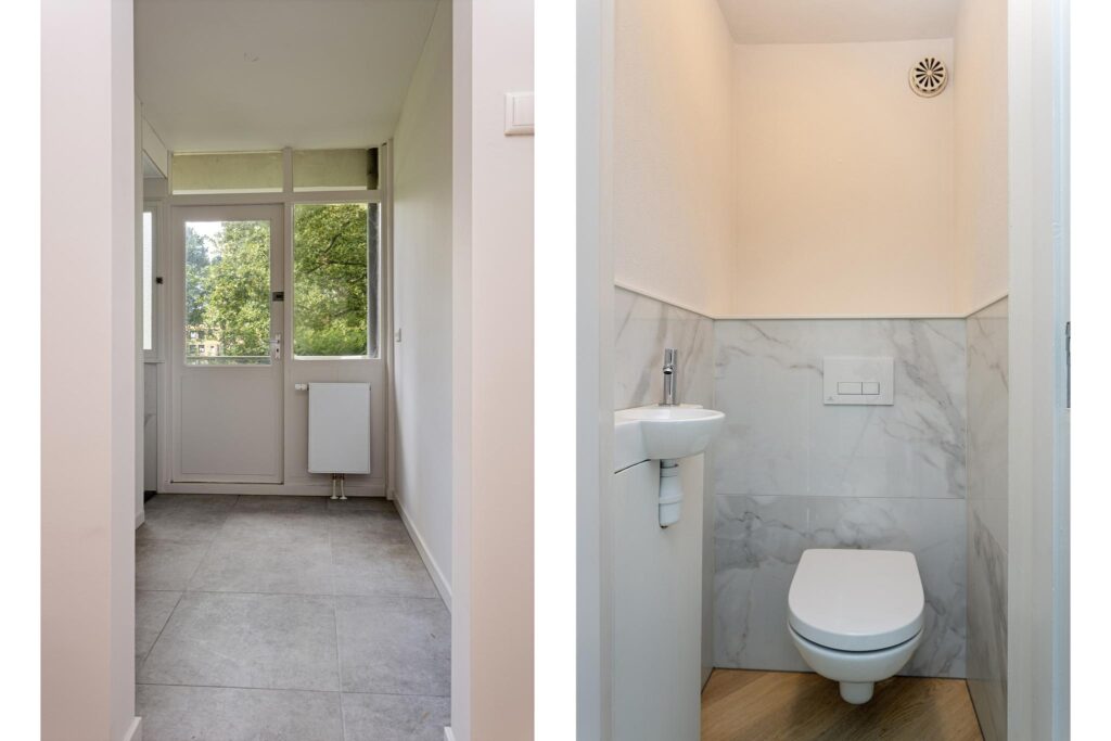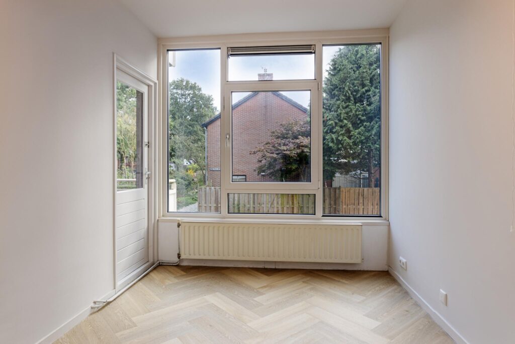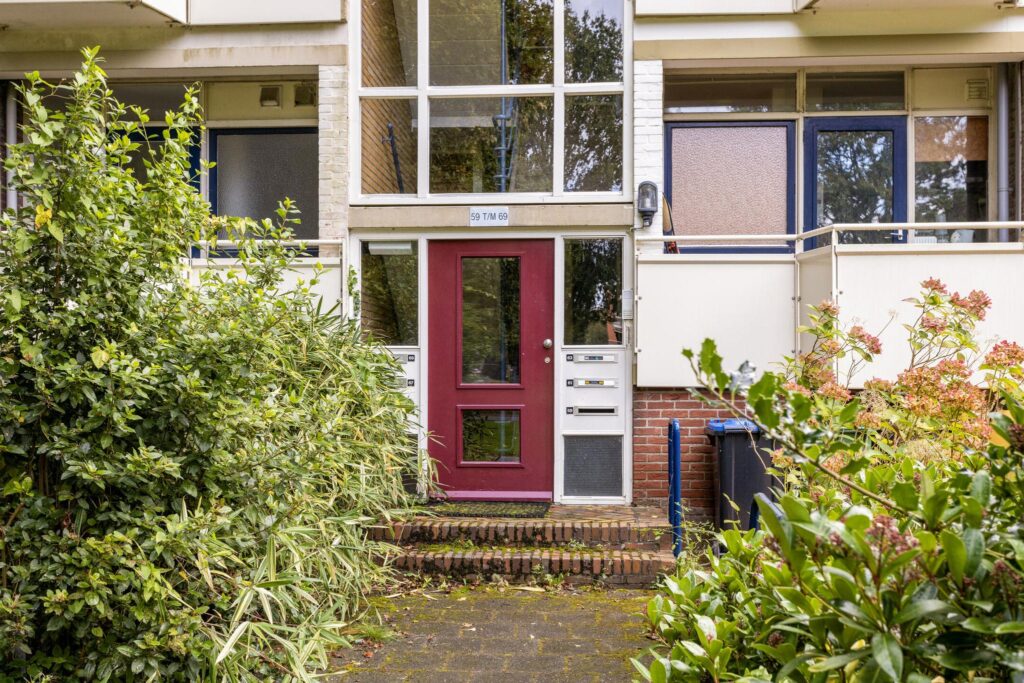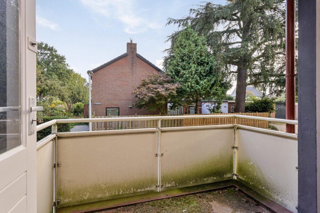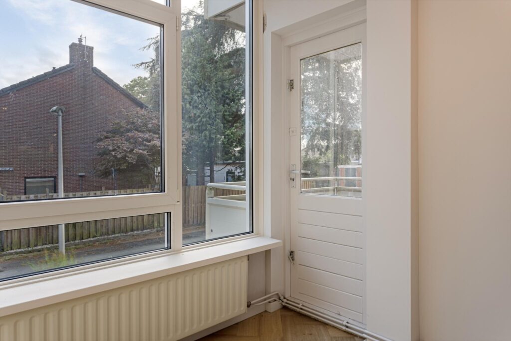 De indeling bestaat uit een hal met gemoderniseerd toilet, en een stook- annex bergkast. De beide slaapkamers zijn aan de achterzijde gesitueerd en leiden beiden naar één van de balkons. De doorzon woonkamer sluit ook aan op dit balkon, maar ook op die aan de straatzijde. Daarnaast beschikt de woonkamer over een open - moderne - keuken. Het geheel wordt gecompleteerd door een eveneens gemoderniseerde badkamer.